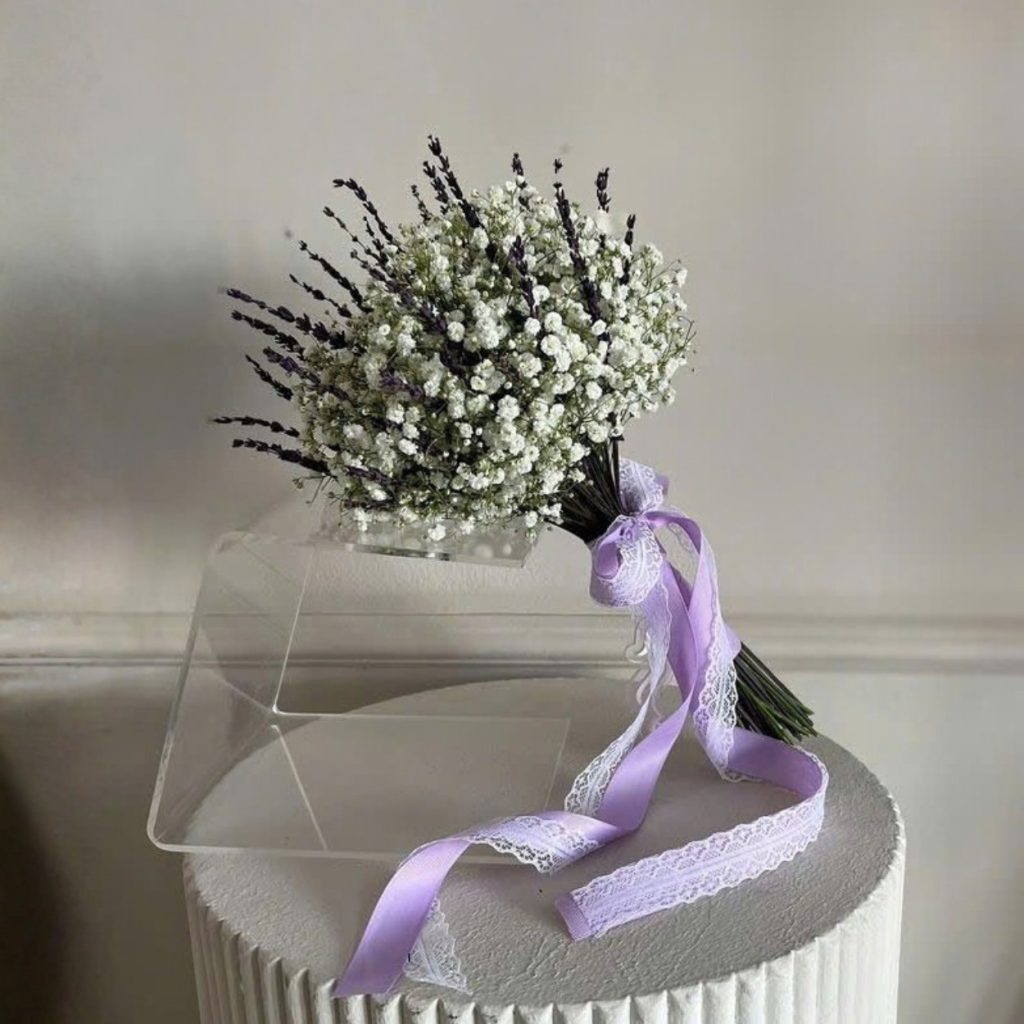 Bó hoa “Ivory Muse” sử dụng những bông hoa baby trắng mỏng manh, mang đến vẻ đẹp nhẹ nhàng và thanh khiết, tượng trưng cho sự tinh tế và trân trọng. Hoa lavendo, với sắc tím dịu dàng và hương thơm nhẹ nhàng, tạo điểm nhấn cho bó hoa, mang đến cảm giác thư giãn và tươi mới. Chiếc nơ được thêm vào, làm tăng thêm sự duyên dáng và thanh thoát, tạo nên một tổng thể hài hòa, sang trọng.