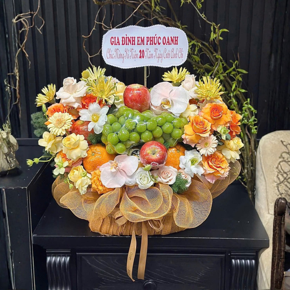“Sự ngọt ngào có thể nhìn thấy” – đó là cảm giác đầu tiên khi chạm mắt “Jacqueline”. Trên nền giỏ mây thủ công, lớp trái cây bóng khỏe và tầng hoa kiêu sa được dựng khối chắc tay, tạo thành một “khu vườn mini” vừa rực rỡ vừa tinh tế. Không rao to, “Jacqueline” thuyết phục bằng tỷ lệ đẹp, sắc độ hài hòa, và từng tiểu tiết được hoàn thiện mịn màng – đúng chuẩn một giỏ hoa trái cây để trao đi mà không cần thêm lời giải thích. (Cảm hứng cấu trúc & phong cách trình bày giỏ/ hộp hoa từ các mẫu tại FlowerSight. )