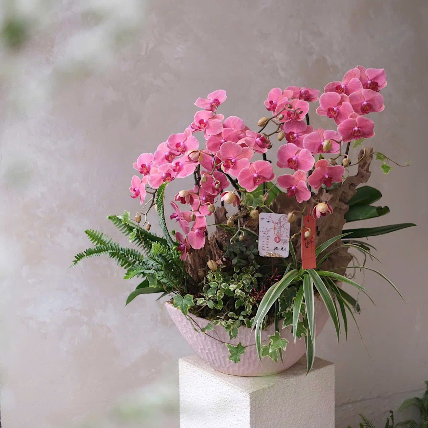 Thiết kế tập trung vào sự kết hợp đa dạng các loài cây, tạo nên một tổng thể hài hòa và sống động. Lan hồ điệp hồng là trung tâm, với màu sắc rực rỡ tượng trưng cho tình yêu và niềm vui. Bên cạnh đó còn có bách hợp sọc, cỏ lan chi, dương xỉ mềm và gỗ lũa làm nền tảng vững chắc.
