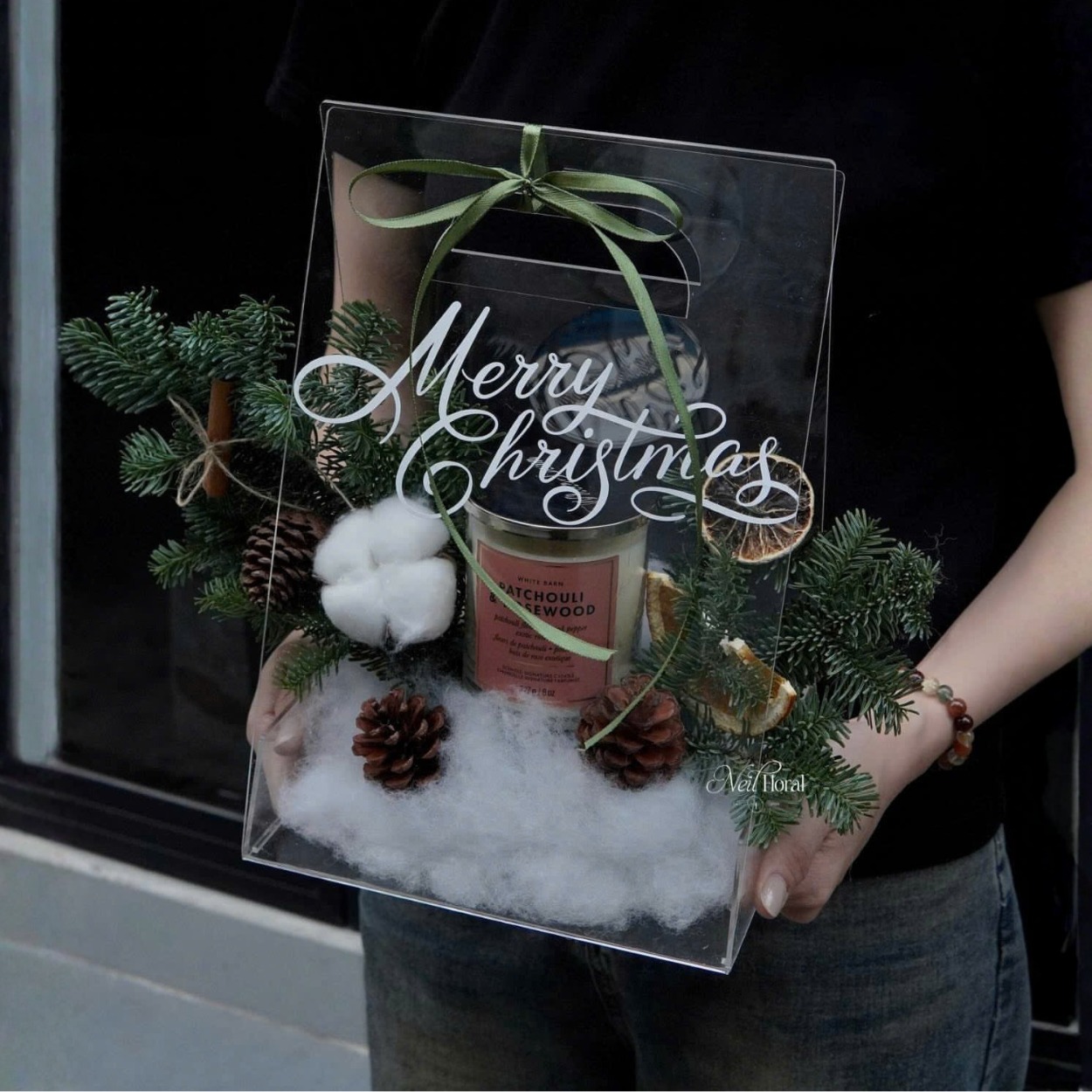 Thay vì những chiếc giỏ truyền thống, Karis chọn chất liệu mica trong suốt làm “khung kính” cho cả bố cục. Dòng chữ Merry Christmas bay bổng trên mặt hộp, như lời chúc thì thầm mỗi lần người nhận chạm tay vào. Khi đặt trên bàn làm việc, kệ sách hay bậu cửa sổ, hộp Noel mica Karis mang lại cảm giác như một ô cửa mùa đông nhỏ xíu, nơi Giáng sinh luôn đang diễn ra.