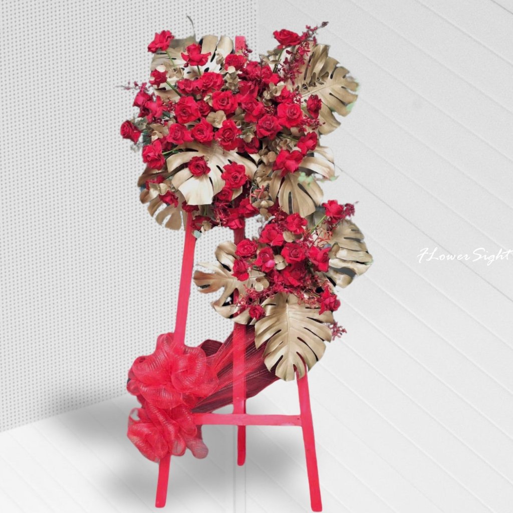 Kệ hoa khai trương tone đỏ là biểu tượng của sự may mắn