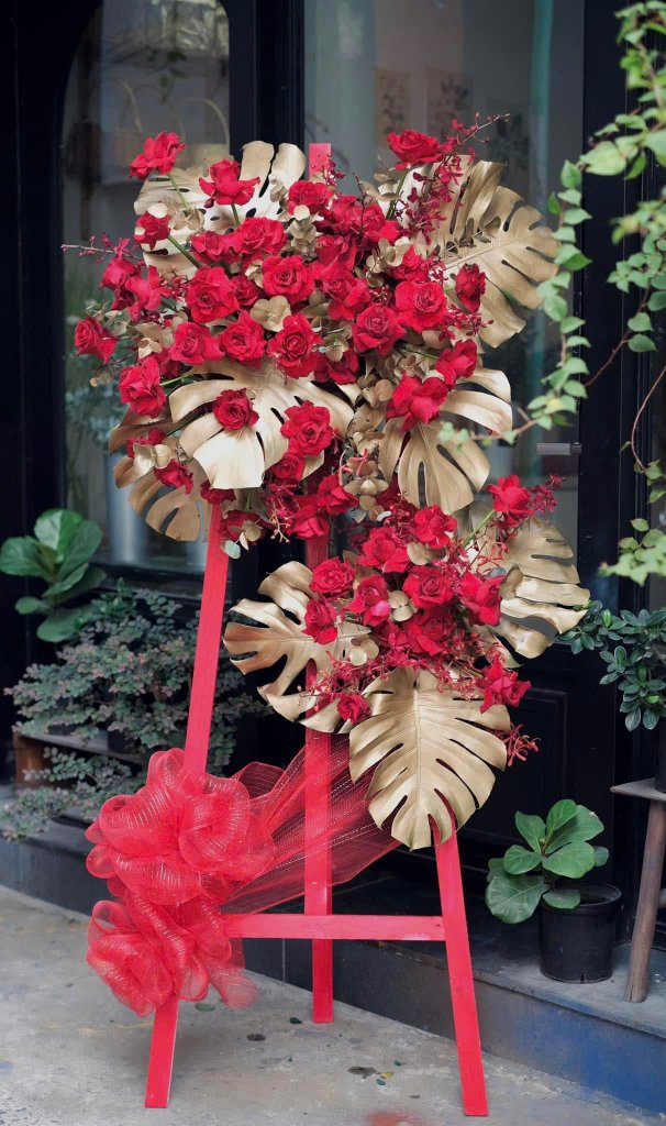 Kệ hoa khai trương tone đỏ mang đến sự thịnh vượng, lộc lá