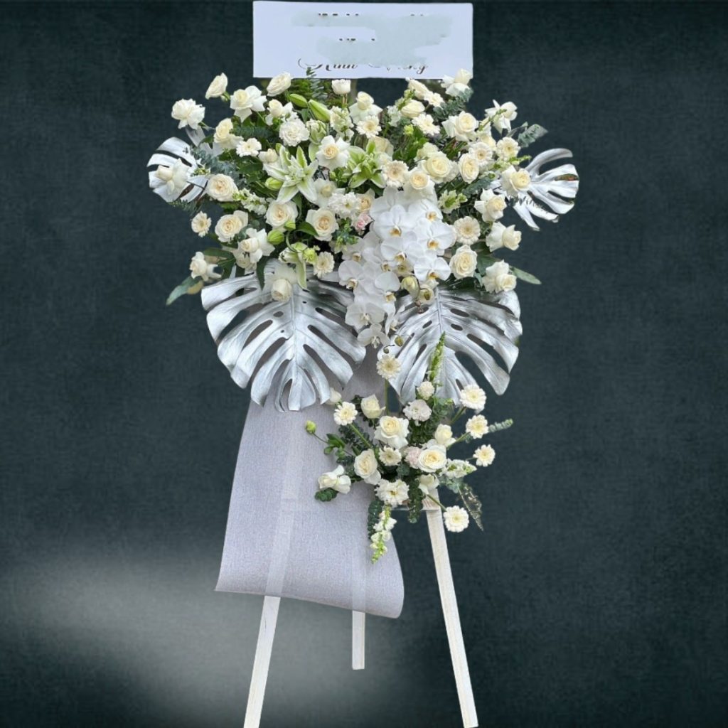 Kệ hoa tươi màu trắng được ưu tiên sử dụng trong những dịp mang tính nghiêm trang, thể hiện lòng thành kính trước sự ra đi của một người rất quan trọng (với bản thân chúng ta)