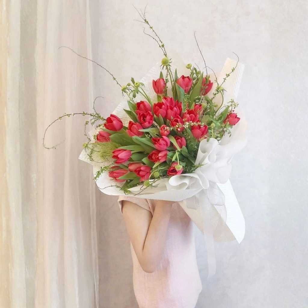 Ngay khi tôi nâng Kelsey lên tay, cảm giác đầu tiên là một làn sóng tươi mát. Những búp tulip đỏ hồng căng mọng ôm lấy nhau, xen giữa là mảng xanh lá phụ trong trẻo, tất cả được nâng đỡ bởi lớp giấy trắng gân tinh khôi và chiếc nơ lụa bản lớn. Kelsey không ồn ào, nhưng đủ rạng rỡ để khiến người nhận mỉm cười ngay từ ánh nhìn đầu tiên.