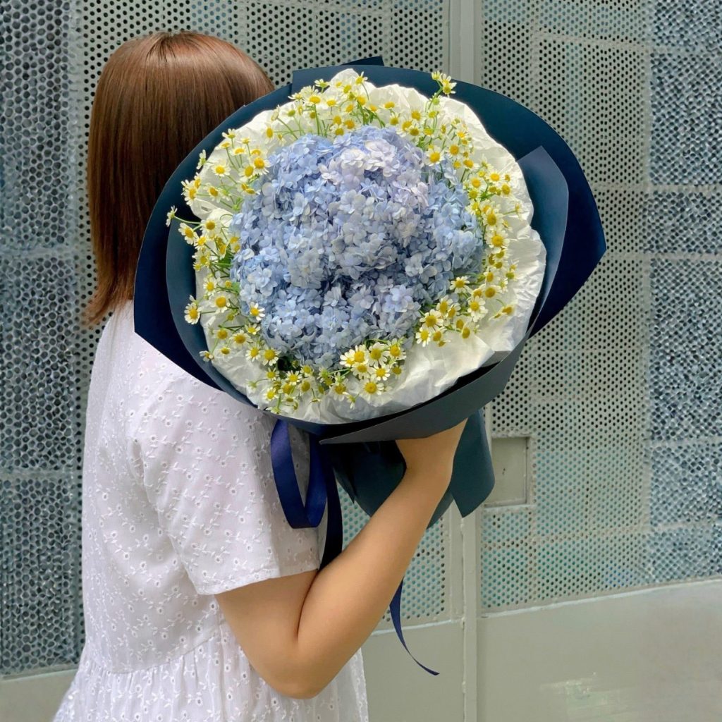 Màu xanh của cẩm tú cầu trong mẫu hoa này cũng không quá lạnh. Đó là sắc xanh có độ dịu, gợi cảm giác tin cậy, điềm đạm và bền bỉ. Khi đi cùng cúc tana trắng vàng, bó hoa trở nên sáng hơn, trẻ hơn và có thêm hơi thở của sự lạc quan. Đây là một thiết kế rất hợp với người thích vẻ đẹp tinh gọn, có gu, không ồn ào nhưng vẫn muốn món quà mình trao đi thật khác biệt.