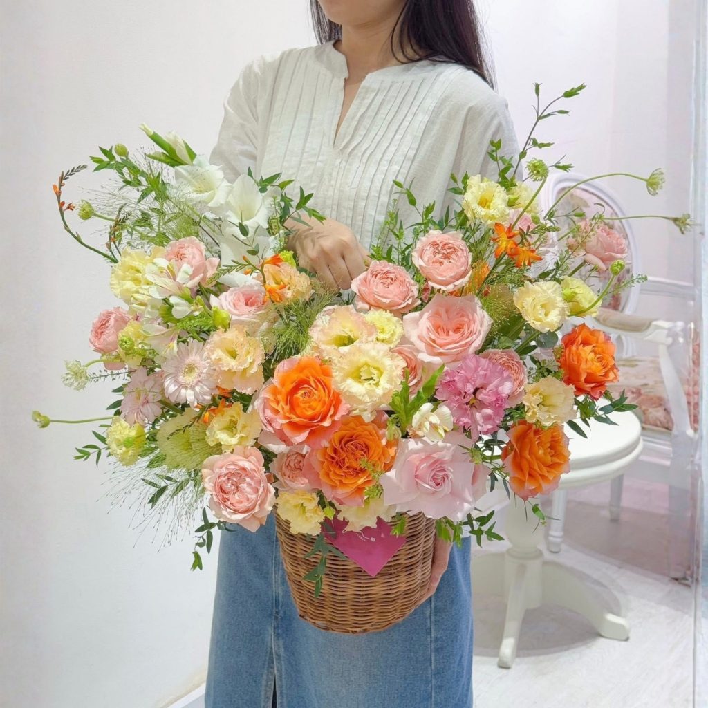 Đây là kiểu hoa phù hợp với những không gian cần sự sáng sủa và có gu: quầy tiếp khách, bàn lễ tân, bàn khai trương hay khu vực trưng bày trung tâm. Khi đặt trong không gian sáng màu, giỏ hoa càng nổi rõ vẻ tươi mới; còn trong nền nội thất ấm, những sắc cam và hồng lại giúp không khí trở nên rộn ràng hơn.