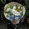 Bó hoa được thiết kế theo cấu trúc tròn tự nhiên, tạo chiều sâu từ lớp nền đến điểm nhấn. Nền chính là cẩm tú cầu xanh pastel trải rộng phía dưới, mang lại cảm giác vững chãi nhưng không nặng nề. Trên nền ấy, những đóa cát tường trắng và cẩm chướng đan xen mềm mại, tạo nên sự chuyển tiếp nhẹ nhàng giữa các tầng hoa.