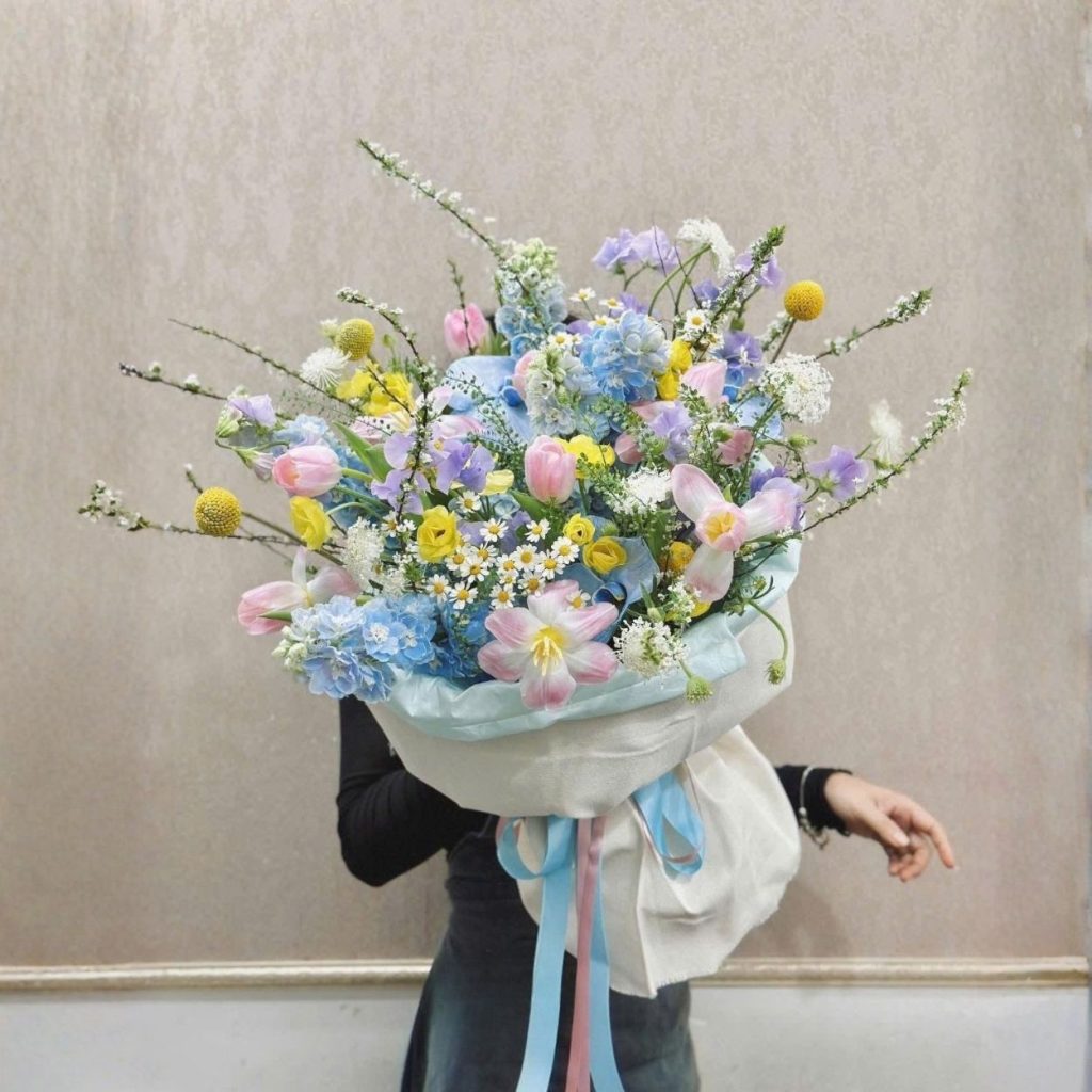 Bên cạnh đó, lá phụ và hoa điểm nhấn như hoa đồng tiền, cúc mẫu đơn tạo thêm chiều sâu và sự cân đối cho bó hoa. Mỗi chi tiết đều được chăm chút tỉ mỉ, đảm bảo mang đến một món quà không chỉ đẹp mắt mà còn chứa đựng thông điệp yêu thương và sự quan tâm sâu sắc.