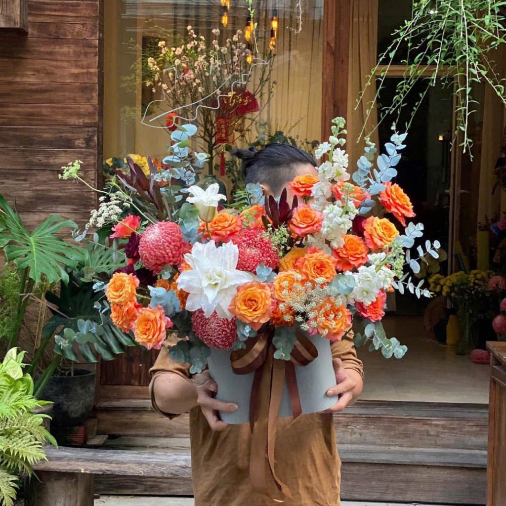 Nếu một khoảnh khắc đẹp xứng đáng được “chụp” lại, thì “Kodak” chính là khuôn hình rực rỡ đó. Tông cam – nâu ấm áp của cúc mẫu đơn như lớp ánh nắng buổi chiều, được đẩy nổi bởi những bông hồng Cam Spirit bung cánh dày và cụm ly trắng thuần khiết ở trung tâm. Phần nền xanh xám mát của lá eucalyptus cân bằng tổng thể, giúp sắc hoa bừng lên mà không chói mắt. Tất cả được đặt trong hộp trụ màu xám lạnh, buộc nơ satin nâu café – vừa lịch thiệp vừa thời thượng.