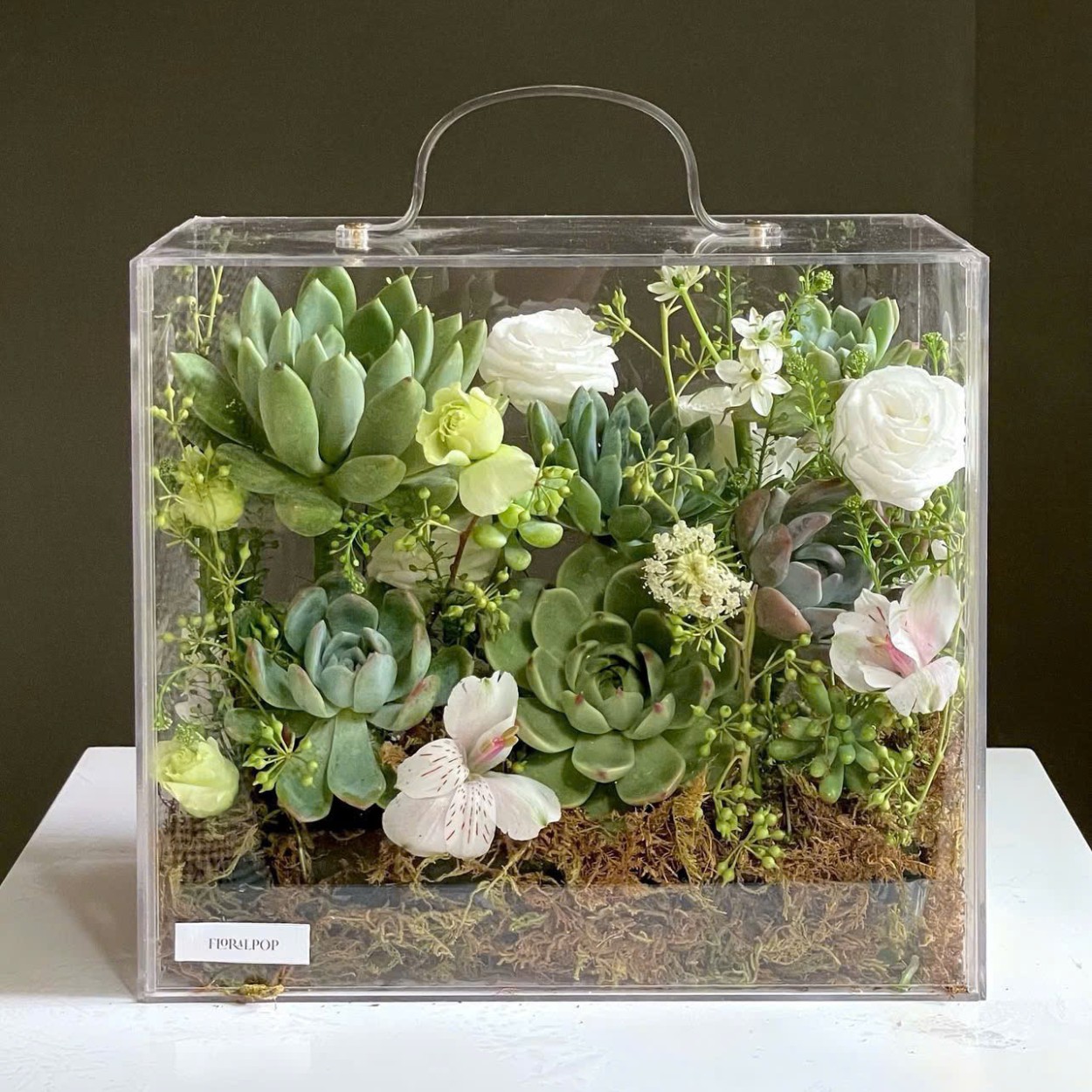 Hộp mica trong suốt không chỉ bảo vệ bố cục hoa mà còn mang ý nghĩa lưu giữ – như một chiếc hộp ký ức, nơi yêu thương được đặt vào, nhìn thấy mỗi ngày mà không hề phai nhạt.