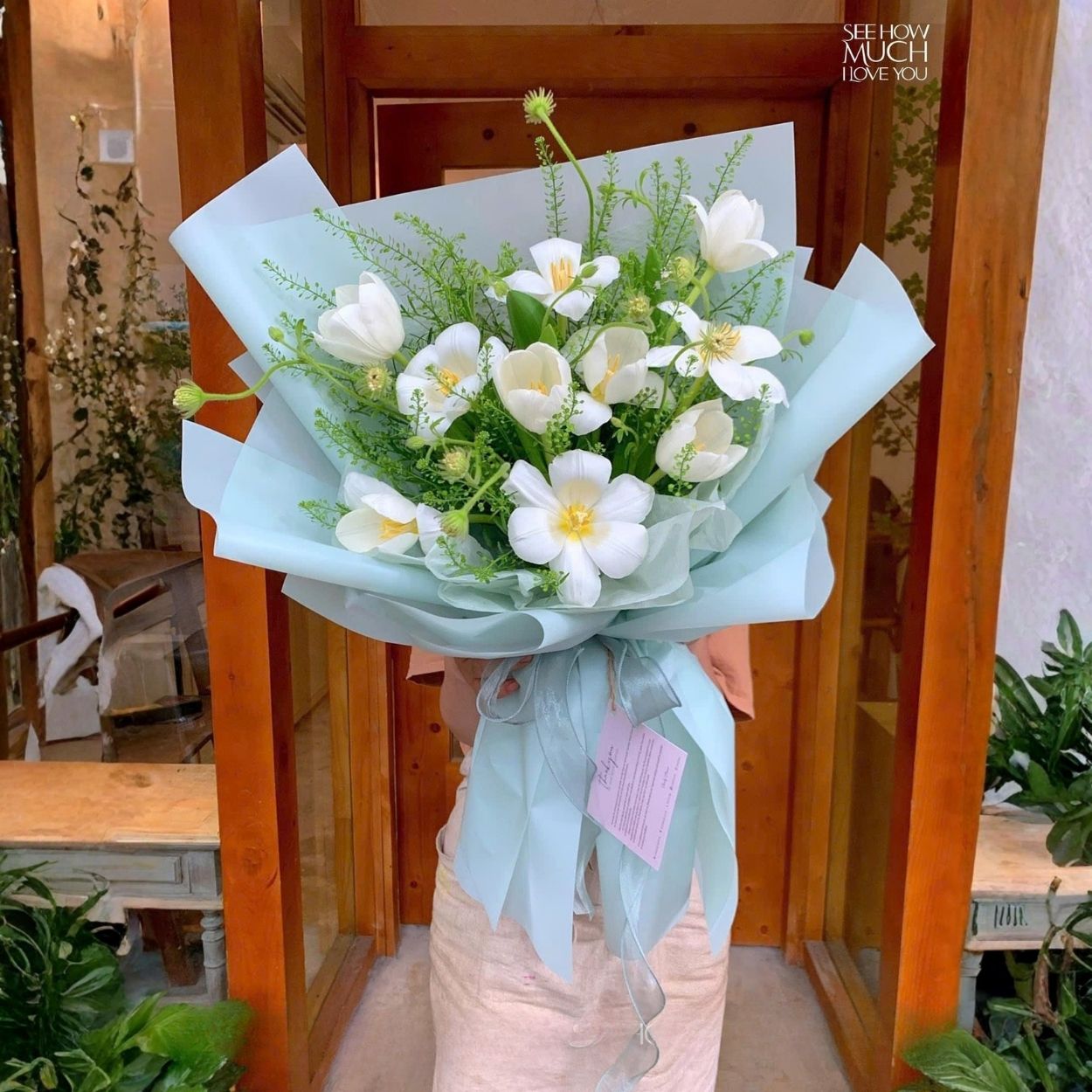 Là Anh chọn bố cục ôm tròn tự nhiên với nhịp mở thoáng. Cụm tulip trắng được đặt ở cao độ khác nhau để tạo chiều sâu thị giác, có bông vừa hé như nụ cười mới chớm, có bông nở đủ để phô lộ nhụy vàng tinh khôi. Vành ngoài là lớp thúy châu xanh mướt đan xen như những nét phẩy mềm, giúp nổi bật sắc trắng của tulip. Rải giữa các tầng là cỏ đồng tiền làm điểm nhấn nhỏ gọn, tạo tiết tấu tinh nghịch nhưng không phá vỡ sự trang nhã. Tất cả được thu gọn gọn gàng trong thế tay cầm chắc, lên ảnh rất ăn sáng mà nhìn ngoài đời vẫn giữ độ mềm mại.