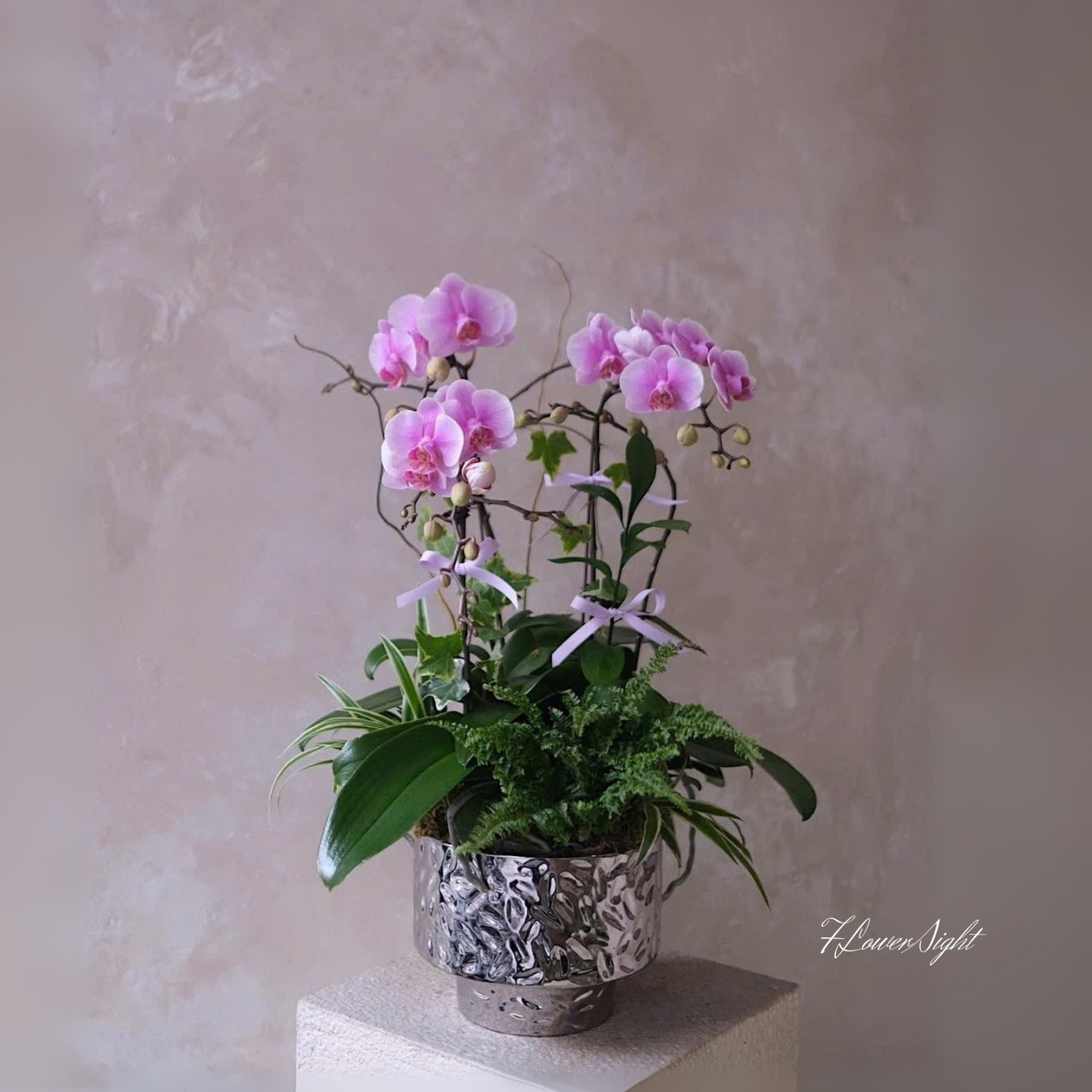 Lan Hồ Điệp Diệu Kỳ gây ấn tượng bởi sắc tím hồng dịu dàng trong chậu hoa mini. Sự kết hợp giữa lan hồ điệp hồng và dương sỉ mềm tạo nên điểm nhấn thanh thoát, thích hợp để trang trí bàn làm việc, bệ cửa sổ hay làm quà sinh nhật bạn bè. Mỗi chậu hoa đều như lời chúc tốt lành, gửi tặng những cảm xúc chân thành và tinh tế.