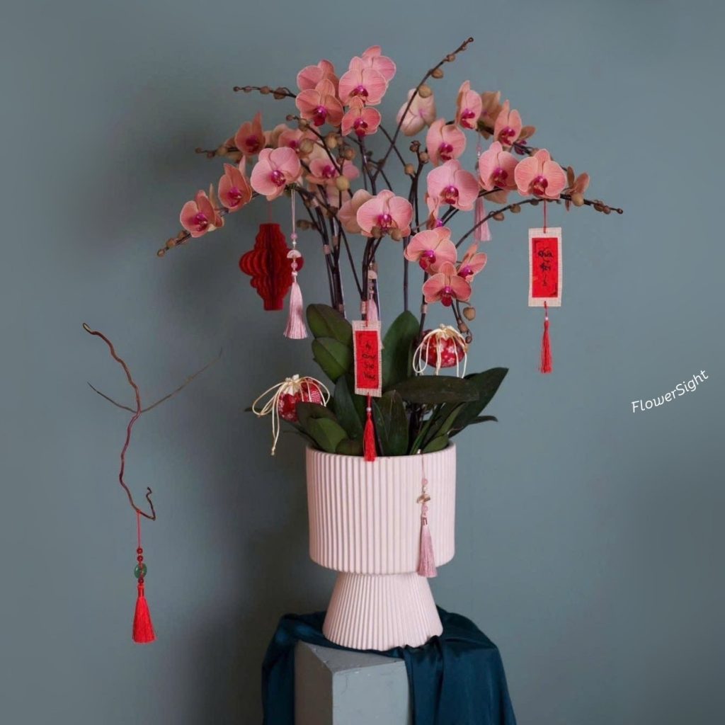 Trong dịp Tết, chậu lan này là biểu tượng của may mắn, tài lộc và khởi đầu thuận lợi. Sắc hoa rực rỡ cùng khánh treo mang đến niềm vui, không khí ấm cúng, giúp không gian thêm tươi mới và đầy năng lượng tích cực.