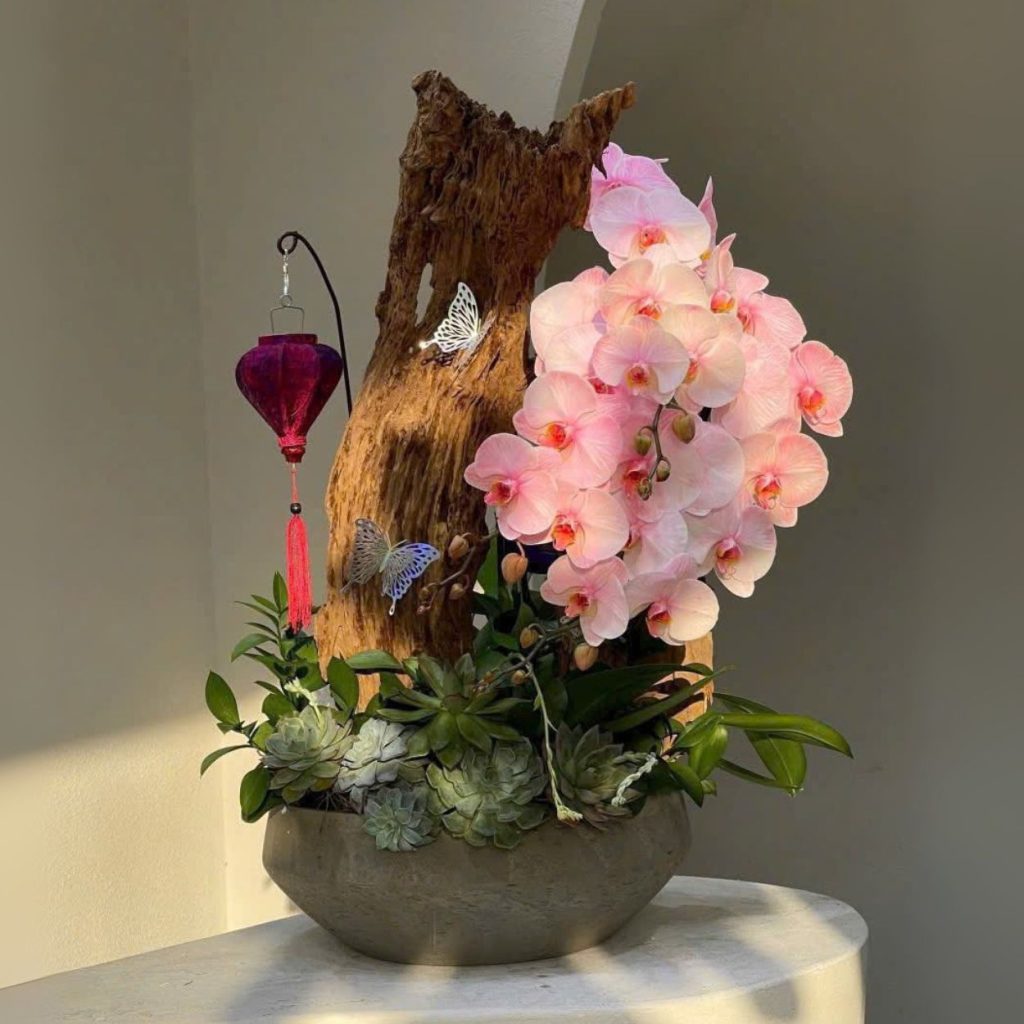 Lan Hồ Điệp Trường Khang là mẫu chậu hoa mang vẻ đẹp tự nhiên, phóng khoáng với điểm nhấn từ lan hồ điệp hồng và lan điệp rừng. Thiết kế được phối hài hòa với lũa, khánh treo và sen đá, tạo nên một tổng thể nghệ thuật và đầy ý nghĩa. Món quà này phù hợp cho các dịp sinh nhật, kỷ niệm hay gửi lời chúc mừng, cảm ơn trang trọng.