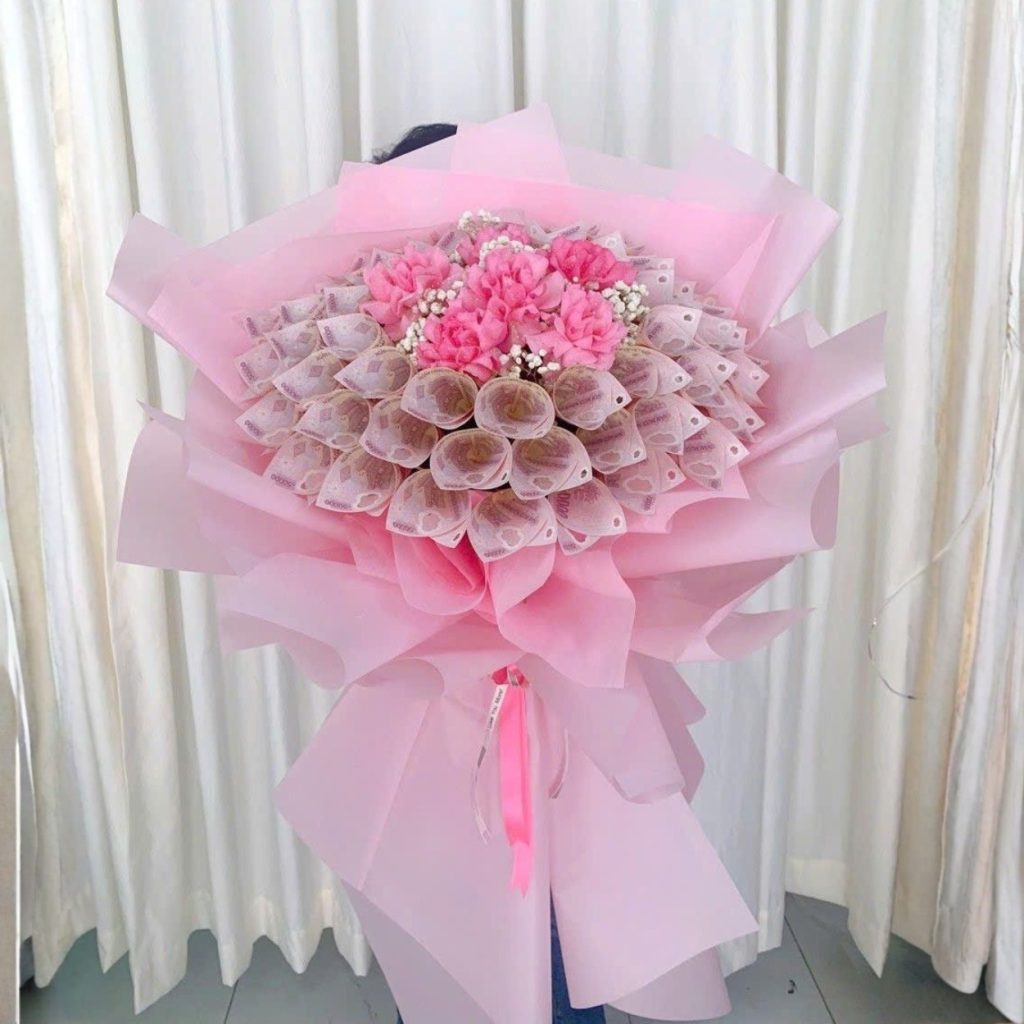 Điểm nhấn là “vầng hoa” từ những tờ 50.000 đồng được cuộn dáng cánh hồng, xếp thành từng vòng đồng tâm như một đoá mẫu đơn đang nở rộ. Ở trung tâm, cụm Ohara hồng phớt nở xoè, cánh dày mịn, tạo chiều sâu thị giác và dẫn ánh nhìn vào trái tim của bó hoa. Baby trắng xen kẽ như những nốt tươi sáng, giúp tổng thể bồng bềnh, trẻ trung hơn mà vẫn giữ được sự trang nhã. Toàn bộ bảng màu hồng – trắng được tiết chế tinh tế: hồng ấm áp làm nền cảm xúc, trắng thanh khiết tạo độ thoáng, khiến bó hoa lớn mà không nặng nề.