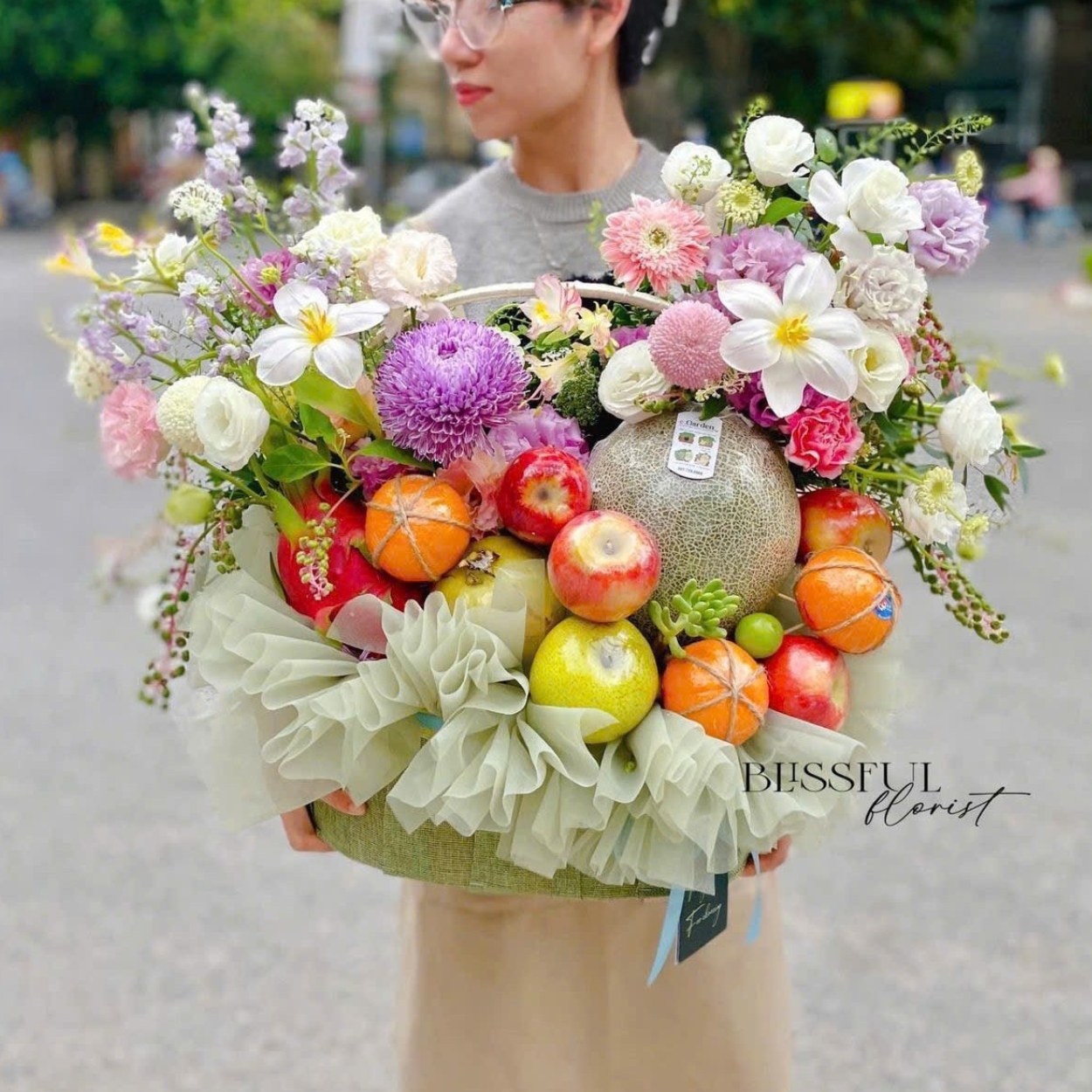 Bảng màu trắng – kem – hồng phấn – tím nhạt – xanh non tạo hiệu ứng trong trẻo, hiện đại. Tulip và thủy tiên kéo ánh nhìn lên cao, ping pong và cúc bản to giữ nhịp nhịp điệu tròn đầy, cát tường và cẩm chướng đệm nền cho lớp trái cây rực rỡ. Dải voan xếp ly giống “làn mây” ôm lấy giỏ, khiến cả tác phẩm trông nhẹ tênh và sang.