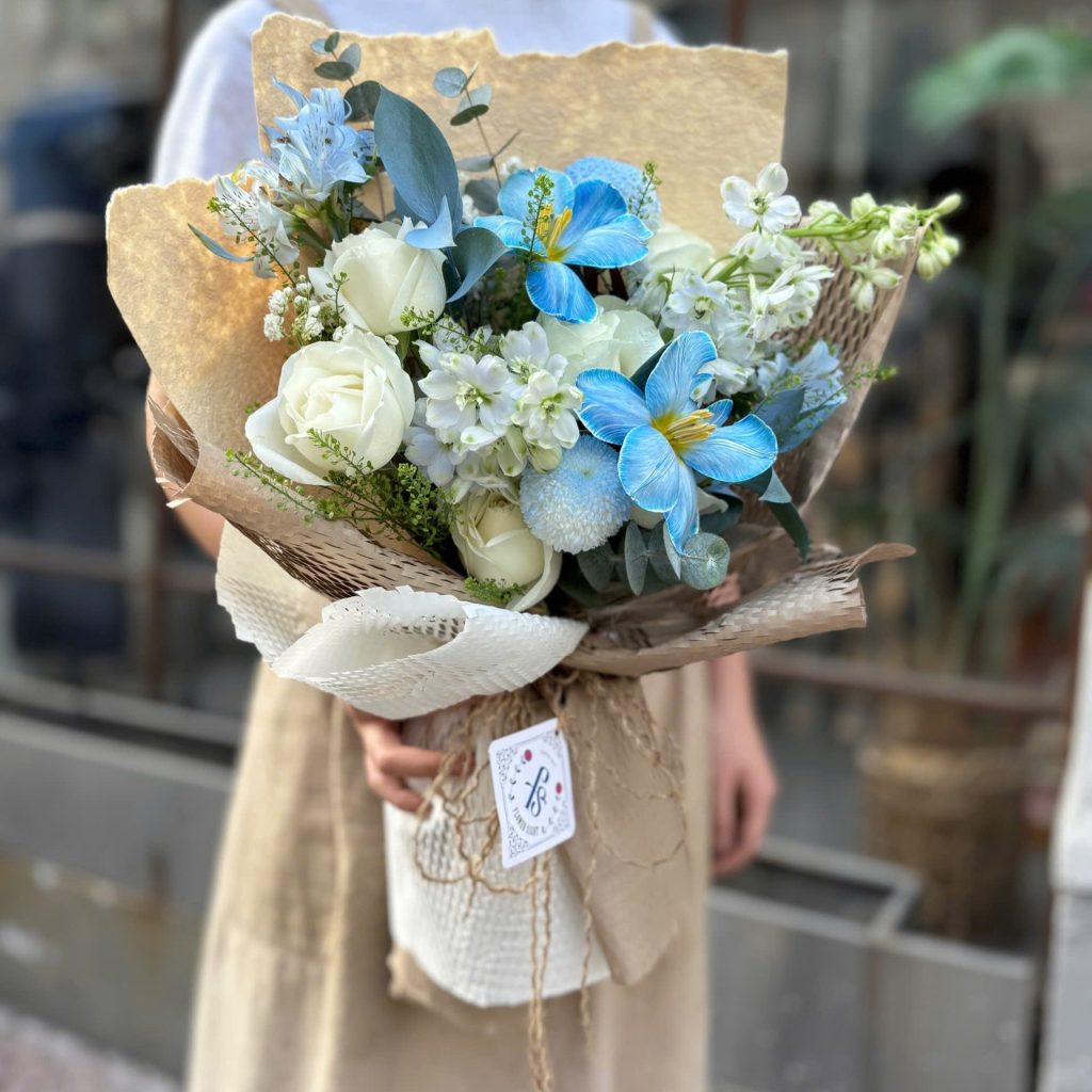 Ngay từ cái nhìn đầu tiên, tổng thể bó hoa mang gam màu xanh – trắng nhẹ nhàng nhưng không hề nhạt nhòa. Sự phối hợp tinh tế giữa màu sắc và bố cục tạo nên cảm giác mát mắt, thanh lịch nhưng vẫn đủ nổi bật để thể hiện sự trân trọng trong dịp đặc biệt.