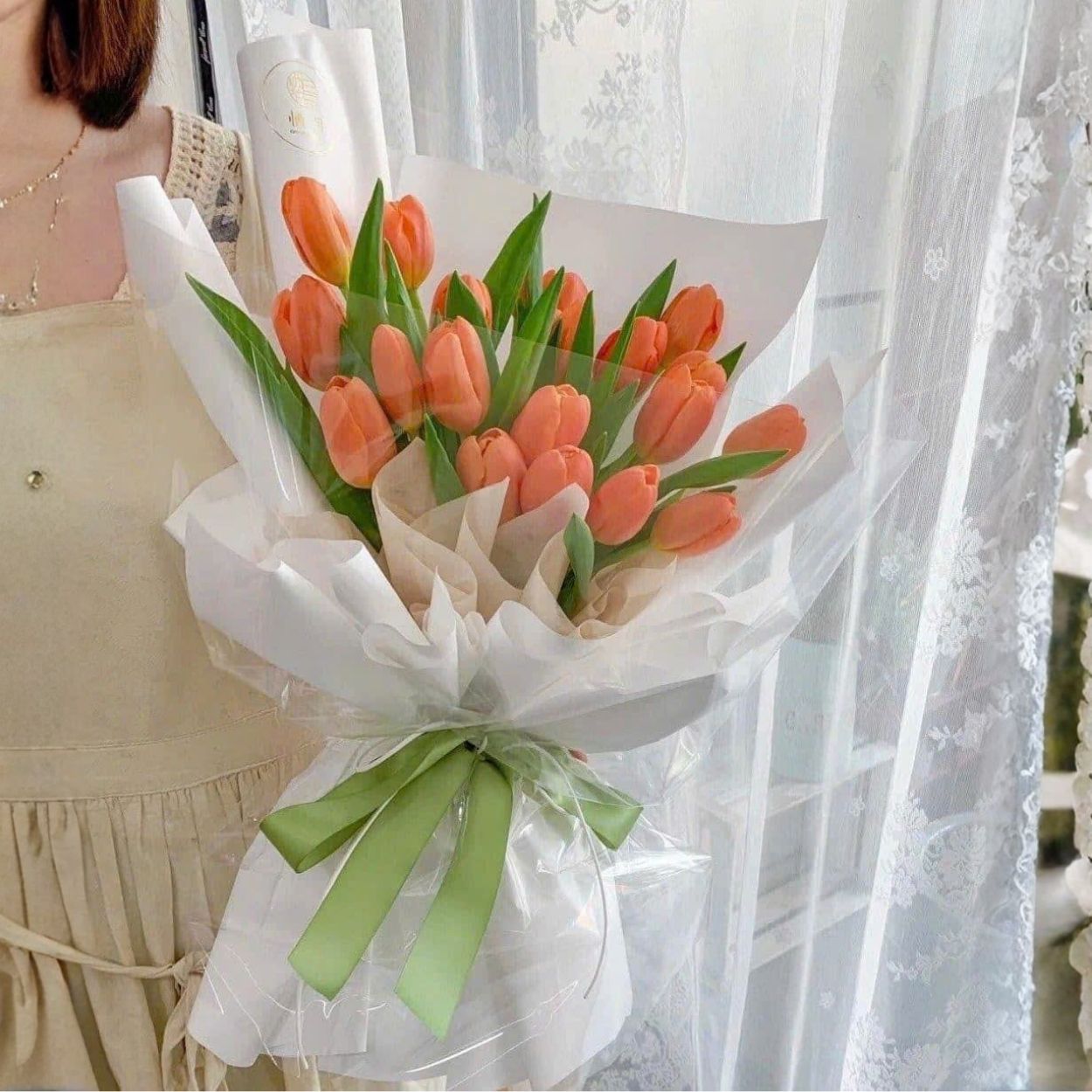 Lớp giấy trắng mờ ôm nền, lớp nilon trong suốt phủ ngoài như một tấm kính dịu, làm nổi bật sắc cam đào của hoa và độ xanh non của lá. Phần nơ bản lớn màu xanh lục non giúp trung hoà tông ấm của tulip, tạo cảm giác mát lành, hiện đại. Sự kết hợp này khiến bó hoa vừa “ăn ảnh” ở mọi góc chụp, vừa đẹp mắt khi cầm trên tay.