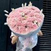 Điểm nổi bật nhất của bó hoa nằm ở phần cẩm chướng hồng được sắp xếp dày, ôm tròn đầy đặn như một cụm mây hồng đang nở bung. Mỗi bông hoa có cánh xếp nhiều lớp, viền cánh lượn nhẹ, tạo nên bề mặt bồng bềnh và sống động. Sắc hồng của cẩm chướng không quá đậm, không chói mắt, mà nghiêng về gam pastel dịu, gợi cảm giác ấm áp, nữ tính và dễ làm người ta mềm lòng. Nhìn tổng thể, bó hoa mang đến sự đầy đặn nhưng không nặng nề, nổi bật nhưng vẫn giữ được nét thanh.
