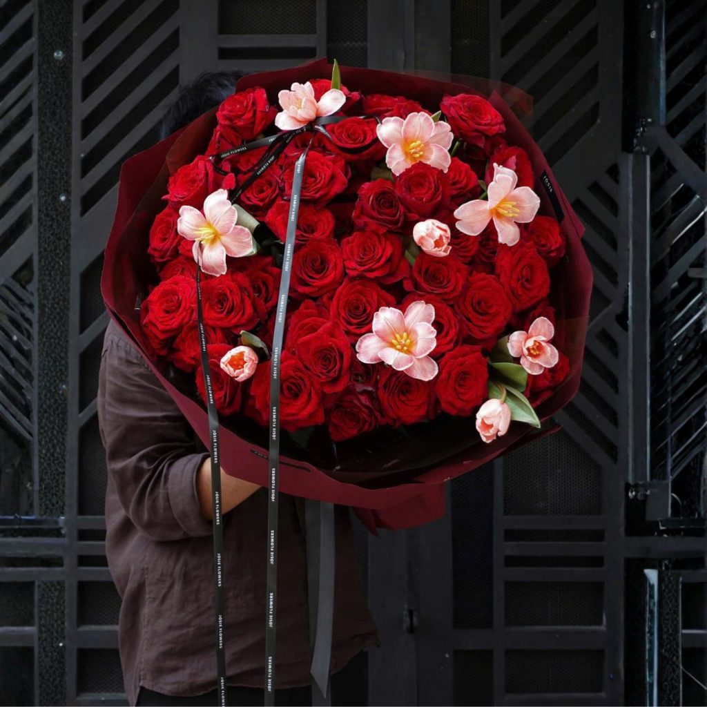 Điểm cuốn hút của bó hoa nằm ở bố cục tròn đầy, dày dặn, tạo cảm giác “được ôm” ngay từ ánh nhìn đầu tiên. Hoa hồng đỏ được chọn theo tông đỏ sâu, cánh dày, nở vừa độ để giữ form đẹp và lên màu sang. Xen giữa là tulip hồng phấn như những nốt lặng tinh tế—màu hồng không gắt, mà mỏng nhẹ, trong trẻo, giúp bó hoa cân bằng cảm xúc: ấm áp nhưng không quá nặng, nổi bật nhưng vẫn mềm.Phần giấy gói tông burgundy trầm sang tạo nền hoàn hảo để sắc hoa bật lên, đồng thời giữ cho tổng thể nhìn “chững chạc” và thanh lịch. Nơ ruy băng đen thả dài như một nét ký tên cuối cùng—gọn, sang, và rất có chủ đích. Lượng lá phụ được tiết chế để bó hoa tập trung trọn vẹn vào hai nhân vật chính: hồng và tulip; nhờ vậy, nhìn ở góc nào cũng sạch, rõ, và có chiều sâu.Nếu bạn muốn bó hoa “nói thay lời” mà vẫn giữ sự tinh tế, “Love Heart” là lựa chọn đúng gu: một thiết kế giàu cảm xúc, đẹp theo kiểu trưởng thành, và dễ chạm vào trái tim người nhận.Gợi ý nhỏ để hoa tươi lâu: khi nhận hoa, hãy cắt vát gốc 1–2cm, thay nước mỗi ngày và đặt bó hoa nơi mát, tránh nắng trực tiếp/luồng gió máy lạnh thổi thẳng.