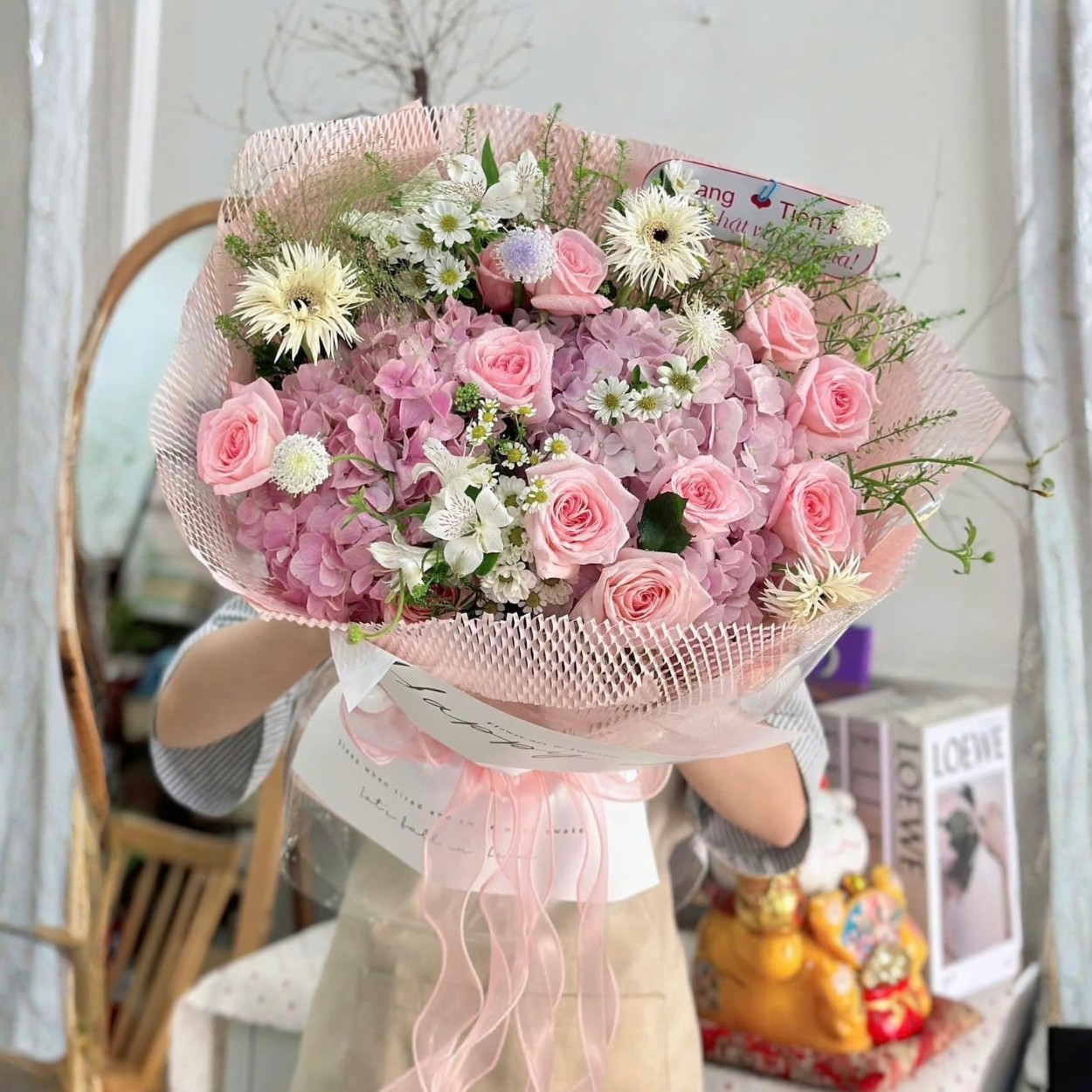 Điều làm bó hoa này đặc biệt là cảm giác bồng bềnh nhưng không rối. Cẩm tú cầu tạo khối tròn mềm, hồng phấn đặt rải đều để giữ nhịp. Xen giữa là đồng tiền (tạo điểm sáng và độ thoáng), cúc tana nhỏ xíu như những dấu chấm vui tươi, thuỷ tiên và thuý châu giúp tổng thể “có tiếng thì thầm” – nhẹ, thanh, và rất sạch.
