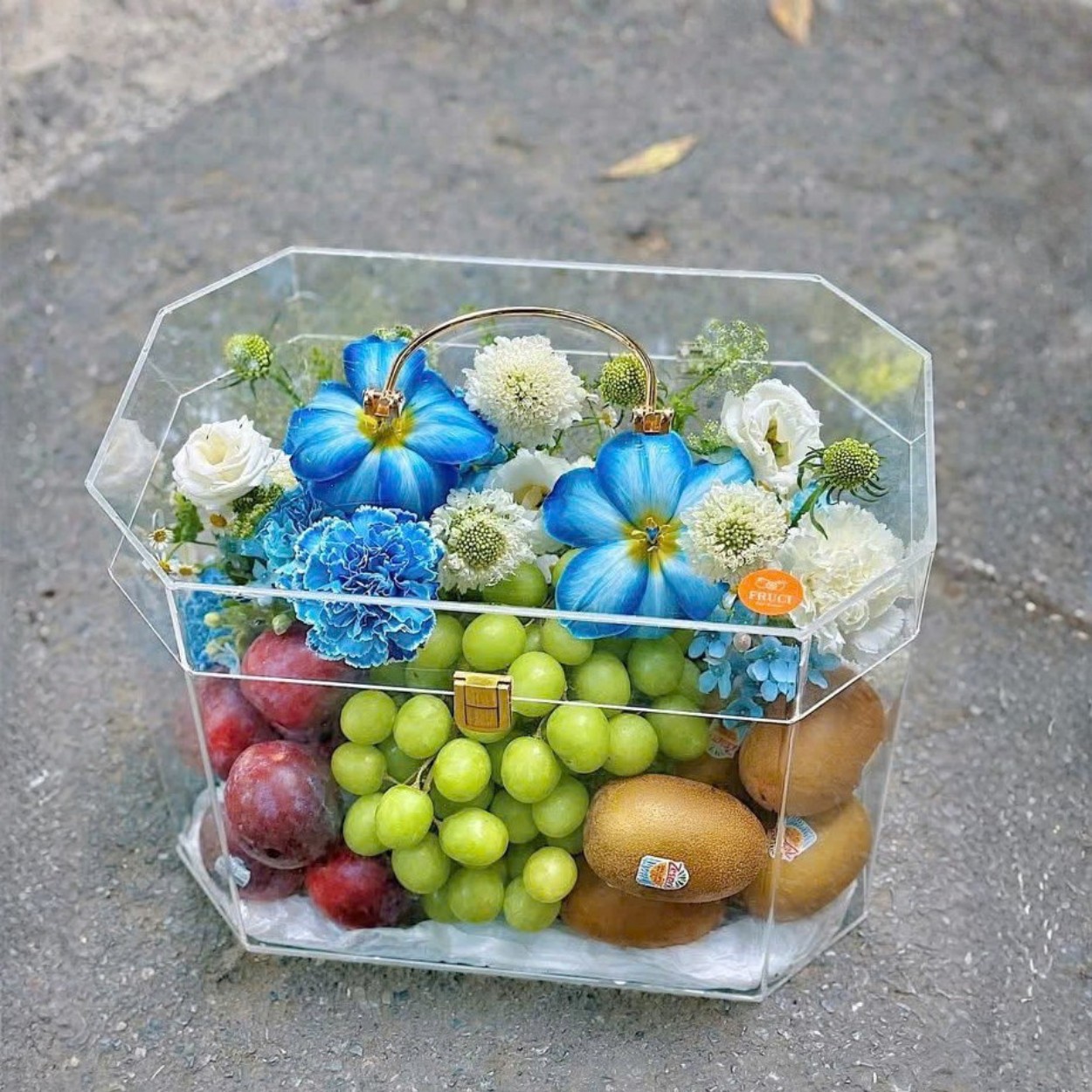 Ngay từ cái nhìn đầu tiên, Love You Better gây ấn tượng bởi phong thái trong trẻo: một hộp mica đa giác trong suốt, tay cầm ánh kim tinh gọn, ôm trọn vẹn sắc xanh–trắng–nâu ấm áp. Ở nửa trên, hoa tulip nâng tone dịu dàng; cụm sao xanh và thúy châu bung nở như những đốm sáng, xen giữa là cẩm chướng xốp mềm tạo lớp chuyển thú vị. Ở nửa dưới, tầng trái cây căng mọng được sắp lớp chắc tay: nho xanh ở trung tâm như “mặt hồ”, hai bên điểm táo đỏ và sapoche nâu sẫm, tổng thể vừa hài hòa thị giác, vừa cân bằng trọng lượng để hộp luôn vững.