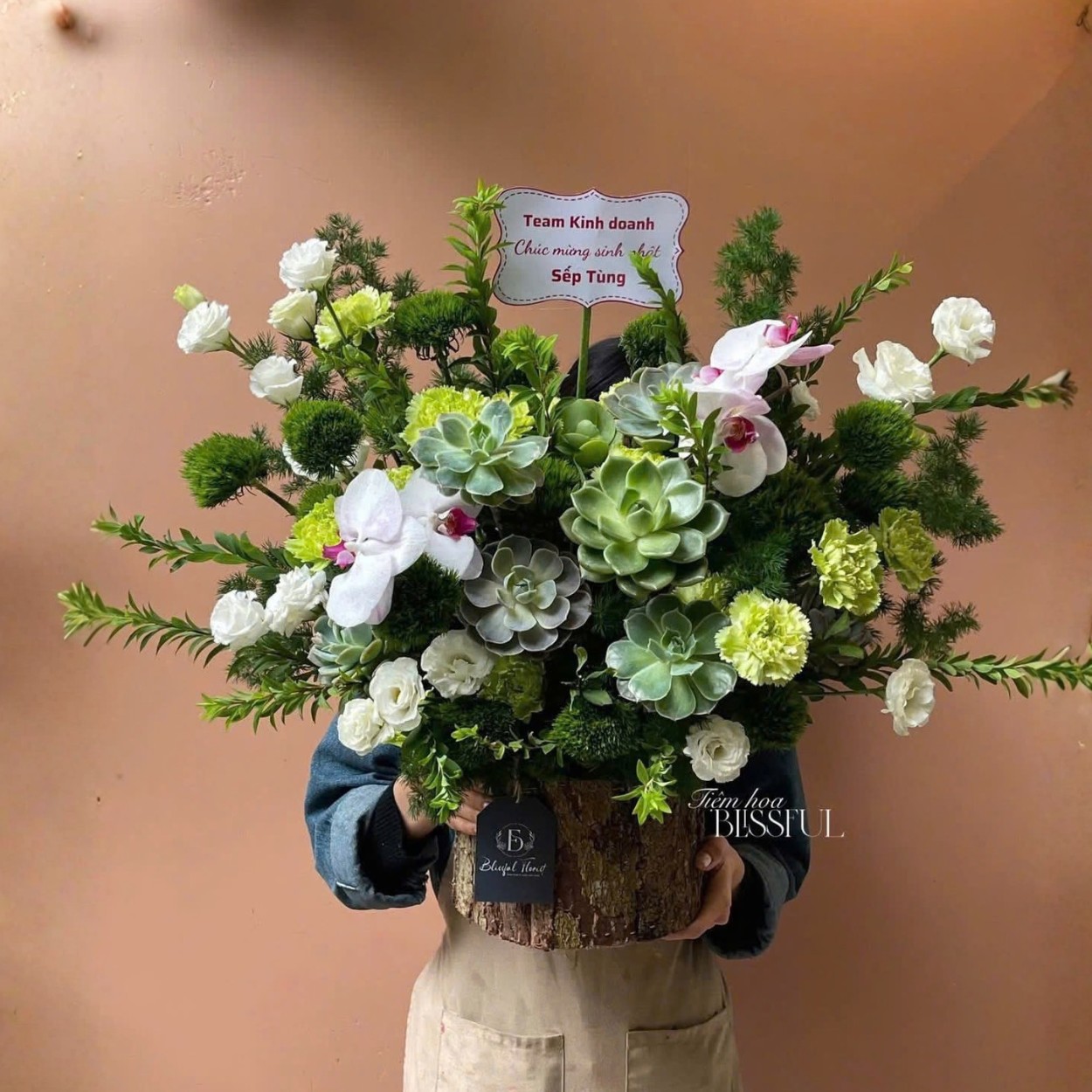 Giỏ hoa này được tạo thành từ những loài hoa tinh tế như hoa lan, sen đá, cát tường và cẩm chướng. Hoa lan với màu sắc thanh thoát mang đến sự quý phái, còn sen đá lại biểu trưng cho sự bền vững và may mắn. Cát tường, với sự nhẹ nhàng, tươi tắn, đại diện cho tình yêu thầm lặng nhưng sâu sắc. Cẩm chướng, loài hoa của sự vĩnh cửu, cũng được thêm vào để làm nổi bật sự tôn kính đối với người nhận. Các loại lá và phụ kiện khác tạo sự hoàn chỉnh, mang đến vẻ đẹp tổng thể đầy sự sang trọng.