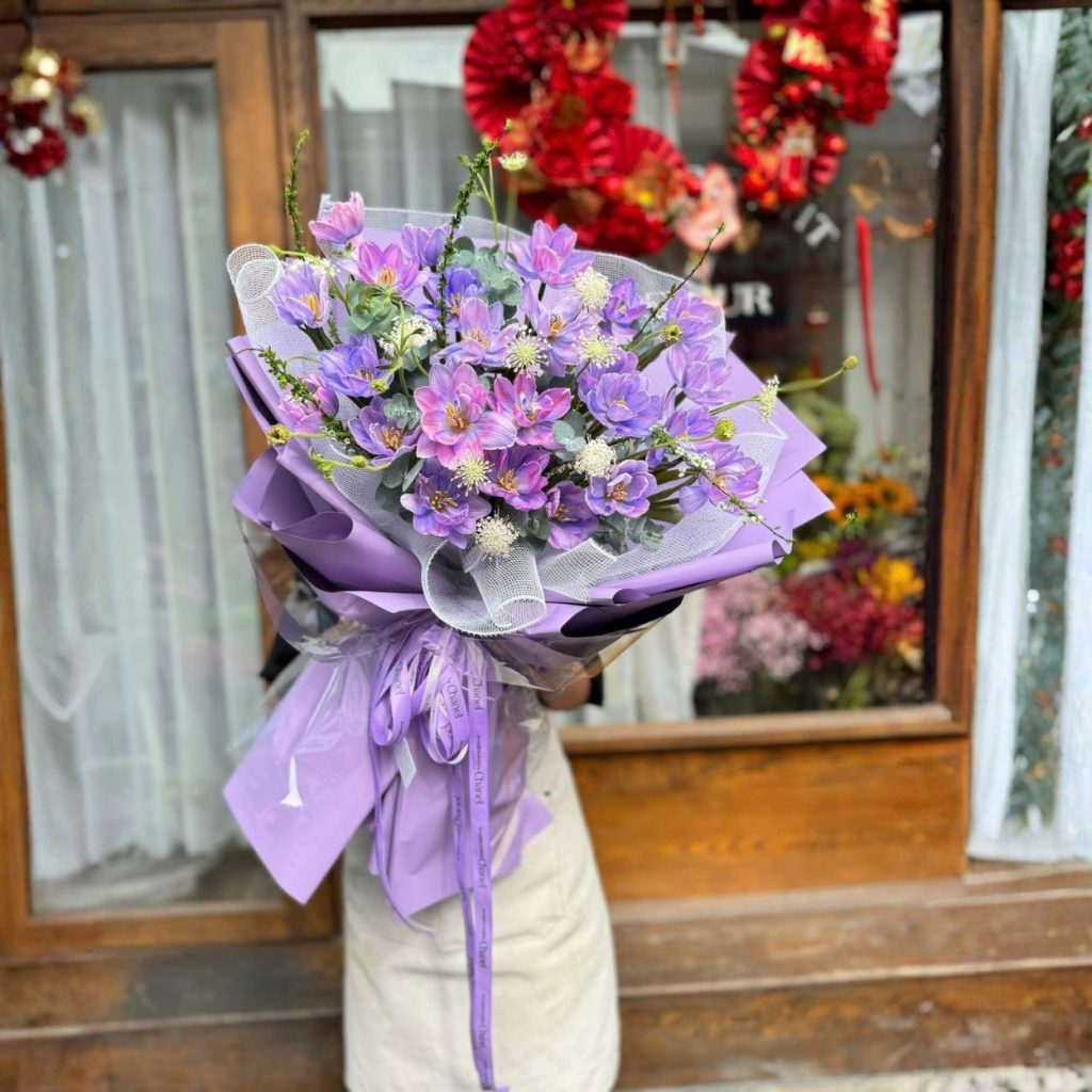 Với Lucy, tôi ưu tiên cảm giác thị giác đầu tiên: sạch và sang. Lớp giấy gói tím chuyển sắc ôm trọn khối hoa, tạo nền đồng điệu mà vẫn đủ tương phản để hoa nổi bật. Lưới mềm đặt xen kẽ như lớp voan mỏng, tăng chiều sâu và độ bồng bềnh mà không che lấp chi tiết. Dải nơ satin được buộc bản lớn, rủ tự nhiên, vừa giữ form vừa tạo điểm nhấn cuối cùng nơi chuôi bó. Khi cầm trên tay, bạn sẽ cảm nhận độ chắc vừa phải của cán bó, dễ nâng niu khi chụp ảnh hay trao tặng.