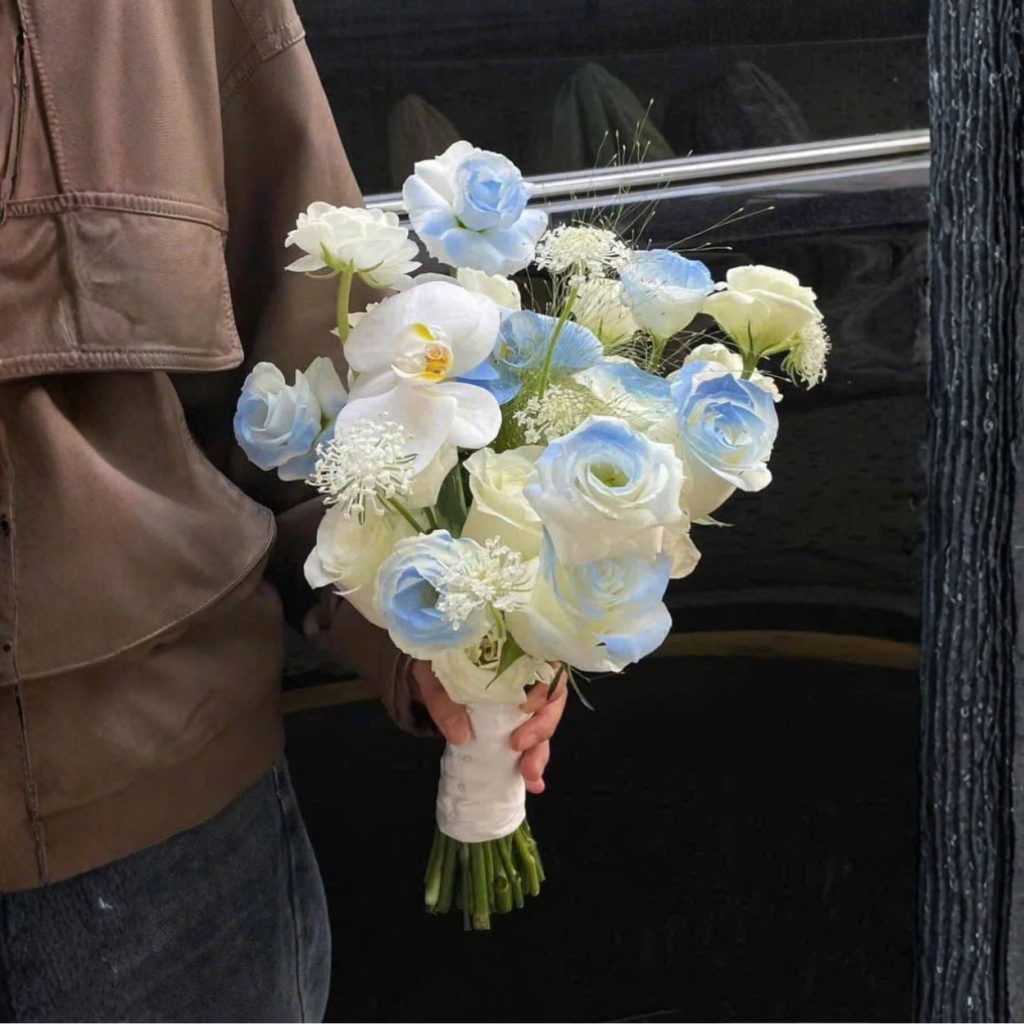 - Hoa hồng xanh loang ánh trắng – điểm nhấn thị giác của tổng thể, mềm mại mà cuốn hút. Những cánh hoa chuyển màu nhẹ như làn khói khiến bó hoa có chiều sâu và sự chuyển động thị giác rất tinh tế.