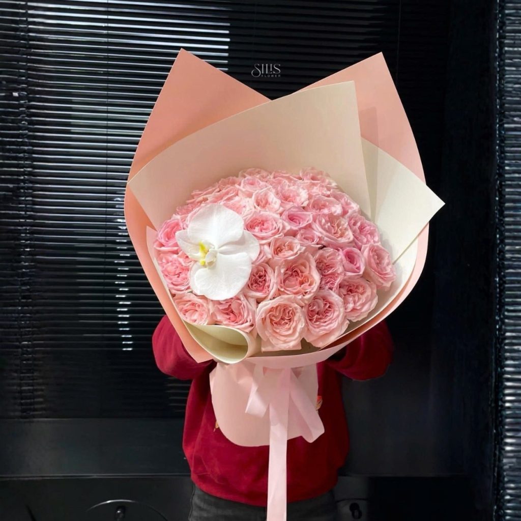 Bó hoa được xây dựng trên nền hoa hồng phấn – những bông hồng có form cánh dày, xoáy sâu vào tâm, tạo hiệu ứng thị giác mềm và đều. Cách sắp xếp hoa theo dạng bán cầu giúp bó hoa trông đầy đặn nhưng không nặng nề, giữ được sự thanh thoát cần thiết.