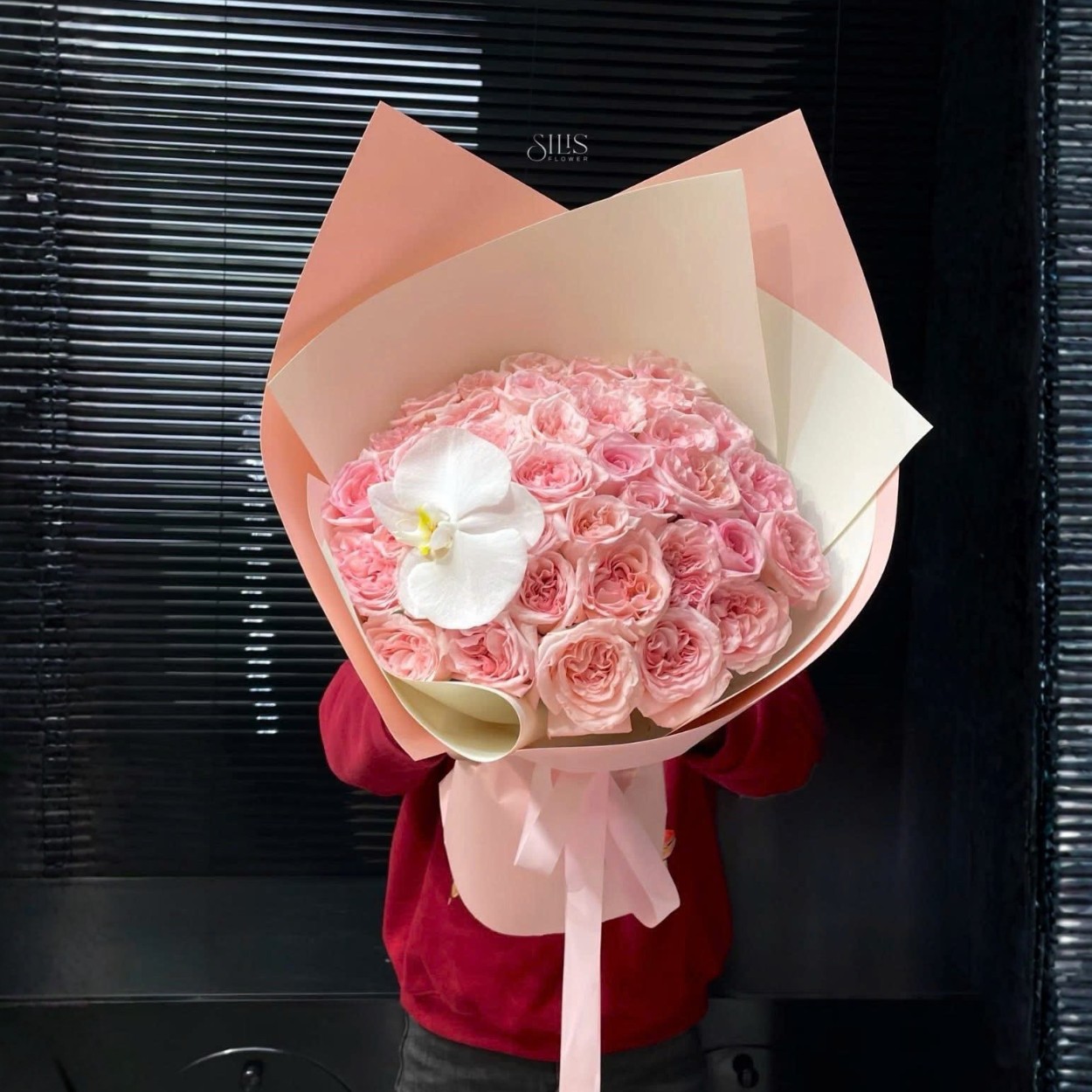 Điểm đặc biệt nằm ở lan hồ điệp trắng – không nhiều, không phô trương, chỉ xuất hiện như một điểm nhấn đúng chỗ. Cánh lan mỏng, sáng, nổi bật trên nền hồng phấn, tạo nên sự tương phản tinh tế về màu sắc và chất liệu. Lan không lấn át hoa hồng mà đóng vai trò như một “khoảng thở”, giúp bố cục trở nên cân bằng hơn.