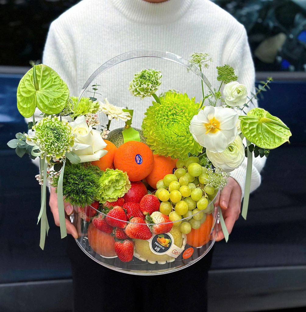 Không chạy theo sự “đầy ắp”, thiết kế này chọn cách kể chuyện bằng khoảng trống và nhịp màu. Giỏ mica phô diễn trọn vẹn độ tươi của trái, còn mảng hoa xanh – trắng làm dịu, khiến tổng thể sang mà không phô trương. Từ những chi tiết rất nhỏ như chiều dài cành tulip, góc nghiêng lá môn, vị trí dải nơ… “Mắt biếc” hướng đến cảm giác an yên ngay từ ánh nhìn đầu tiên.