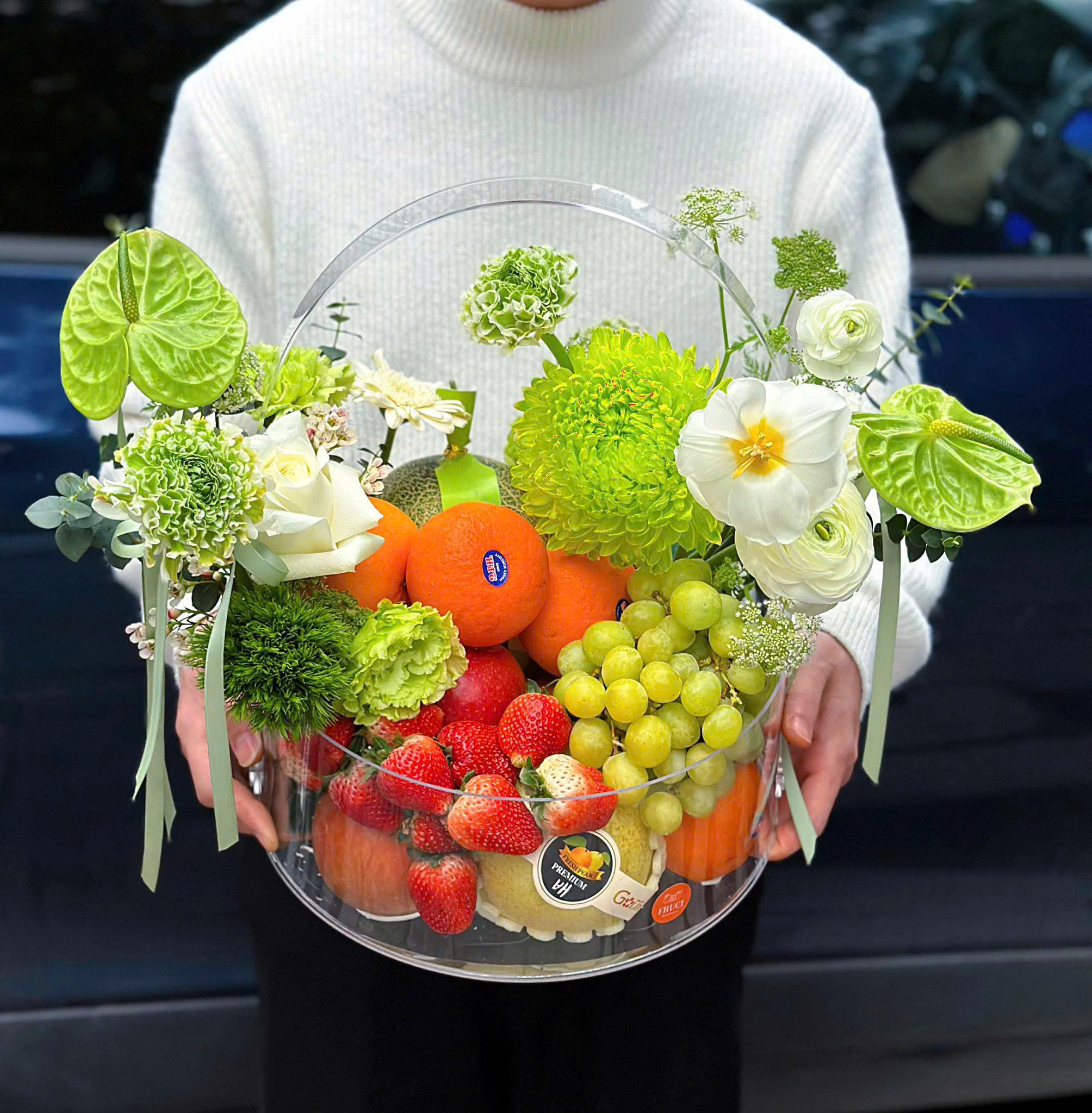 Lấy cảm hứng từ đôi mắt trong veo của mùa xuân, “Mắt biếc” được dựng trên giỏ mica trong suốt, tạo cảm giác nhẹ tênh như không trọng lượng. Lớp nền trái cây được xếp tầng vững chắc: táo và dưa gang làm “đế”, nổi bật trên đó là cam mọng nước, chùm nho xanh mượt, đệm bởi dâu tây đỏ căng – tổng hòa sắc độ tươi mát nhưng giàu năng lượng. Dải nơ lụa xanh non buộc lệch nhẹ, giữ đúng tinh thần tối giản mà tinh tế.