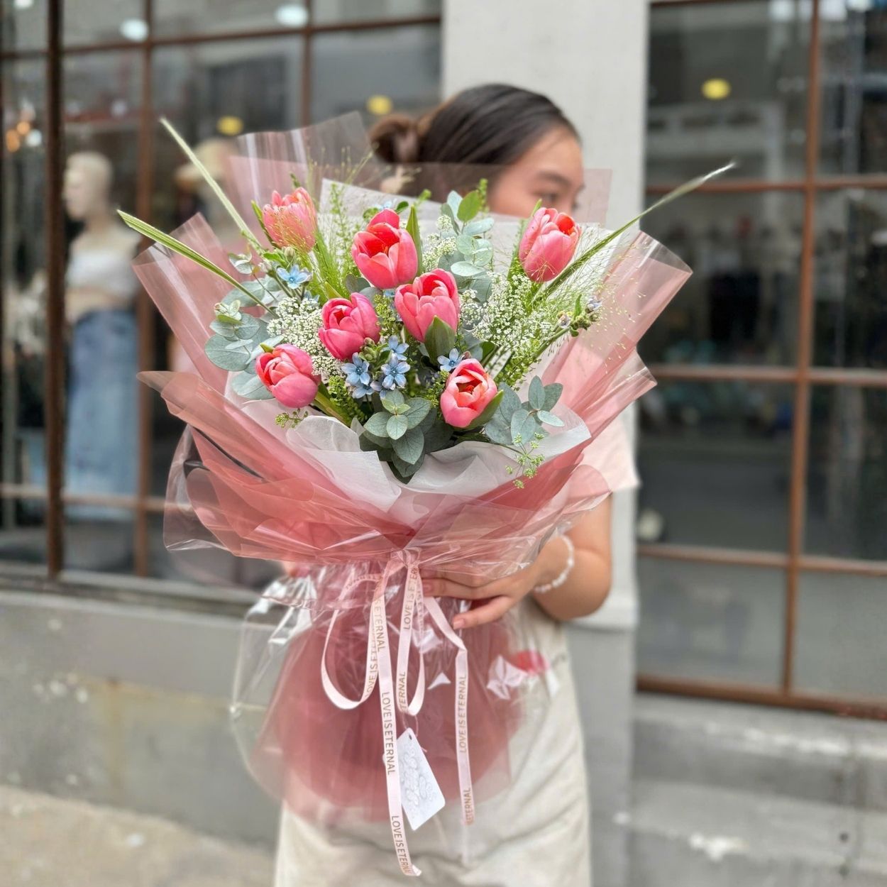 Điểm nhấn thị giác của bó là cụm tulip hồng xếp tầng: nụ – chớm – nở, cho cảm giác chuyển động tự nhiên như khoảnh khắc trái tim từ rung rinh đến vỡ òa. Lớp lá bạc (eucalyptus) hình đồng xu tạo biên độ xanh xám mát mắt, khiến tông hồng không bị “ngọt quá” mà trở nên thanh lịch. Những sợi cỏ mảnh vươn cao giúp tổng thể có nhịp lên – xuống, nhìn từ cạnh hay chính diện đều thấy “ăn ảnh”.