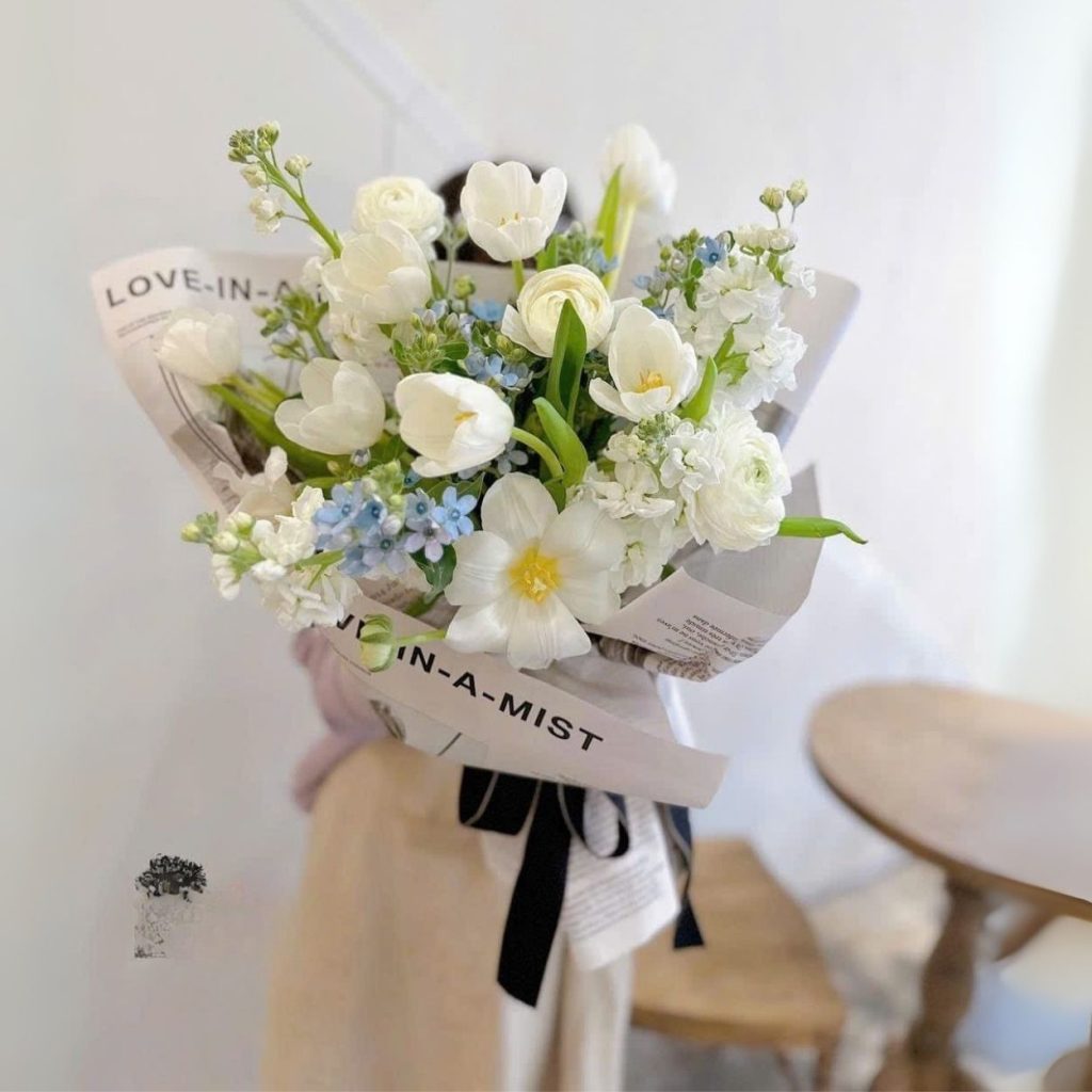 Trắng của tulip và mao lương là nền tảng thuần khiết. Xanh lam nhạt từ sao xanh đưa vào cảm giác an yên, cân bằng. Sắc xanh của phi yến làm dịu thị giác, giúp bó hoa mát mắt ngay cả trong không gian ấm. Tổng thể mang tinh thần thanh lịch Bắc Âu nhưng vẫn có nét Á Đông mềm mại, dễ hòa vào nhiều phong cách nội thất từ tối giản đến vintage.