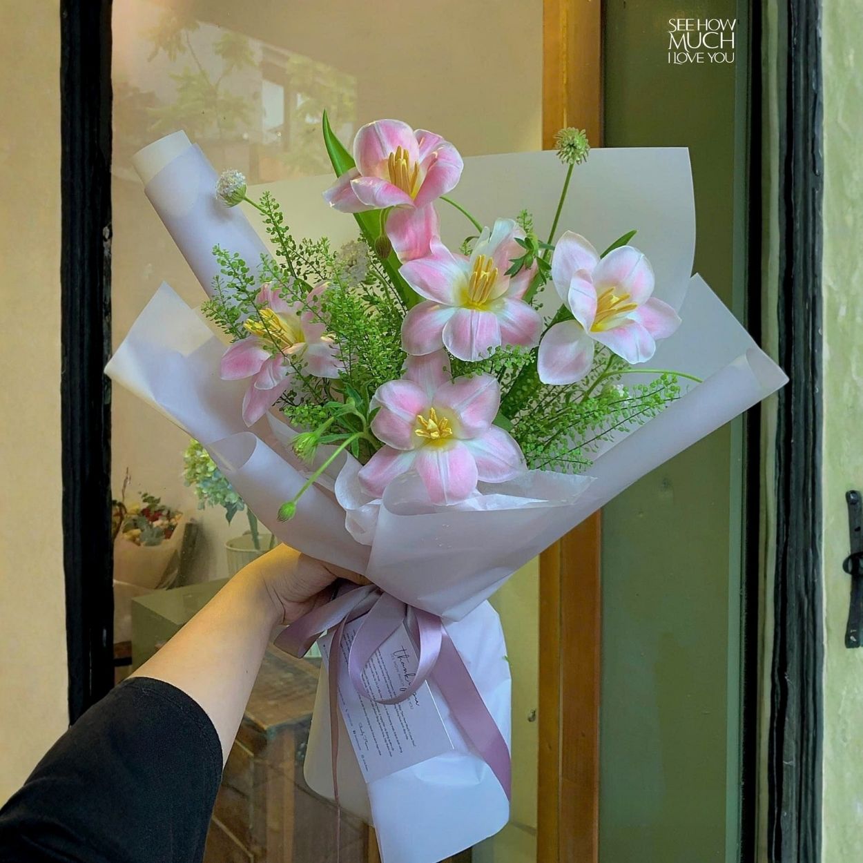 Sự dịu dàng có hình khối. “Meadow” tái hiện cảm giác bước vào thảo nguyên lúc bình minh: nền xanh non mát mắt, vài bông tulip hồng phấn vừa hé nở, nhị vàng ánh lên dưới lớp sương mỏng. Bó hoa được thiết kế theo triết lý “thở” – đặt khoảng trống làm chủ đạo để mỗi bông đều có không gian khoe dáng, người nhận vì thế nhìn thấy vẻ đẹp tự nhiên chứ không phải sự sắp đặt gò ép.