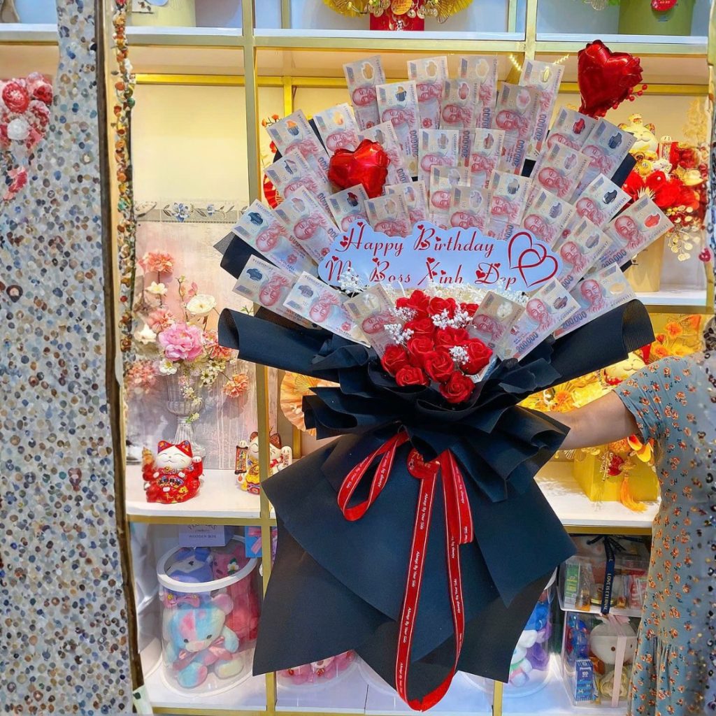 Mơ màng mang trong mình sắc đỏ rực rỡ, điểm nhấn từ những cánh hoa hồng đỏ kiêu sa cùng nơ đỏ mềm mại. Sắc đỏ vốn là biểu tượng của tình yêu, khi kết hợp với sự tinh tế của thiết kế lại càng tỏa sáng. Sự hòa quyện giữa tiền 200k và giấy gói màu đen mang đến vẻ đẹp vừa bí ẩn vừa cuốn hút, khiến món quà trở nên khác biệt.