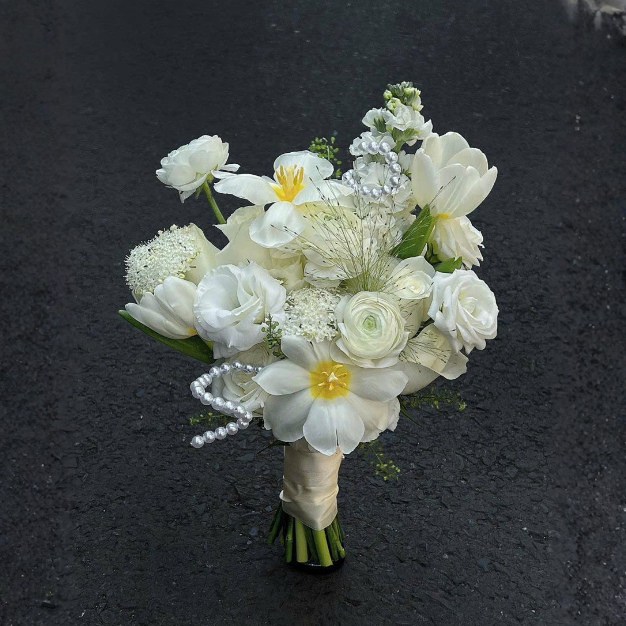 Điểm ấn tượng đầu tiên của Mộng tình yêu là bảng màu trắng – kem chủ đạo, điểm nhấn là nhụy vàng nhạt ở vài bông hoa, tạo cảm giác như ánh nắng sớm khẽ chạm lên lớp sương mỏng trên tay cô dâu. Sự kết hợp của tulip, mao lương và hoa hồng trắng mang đến bề mặt cánh hoa mềm như lụa, xếp lớp tròn đầy, tạo nên form bó gọn gàng, sang trọng.Những cánh tulip trắng thanh mảnh tượng trưng cho tình yêu thuần khiết; mao lương bung nở nhiều cánh, tượng trưng cho hạnh phúc tròn đầy; hoa hồng trắng là lời hứa về sự thủy chung. Tất cả được sắp đặt khéo léo để dù cô dâu đứng dưới ánh đèn tiệc tối hay nắng ngoài trời, bó hoa vẫn nổi bật nhưng không “lấn át” tổng thể trang phục.