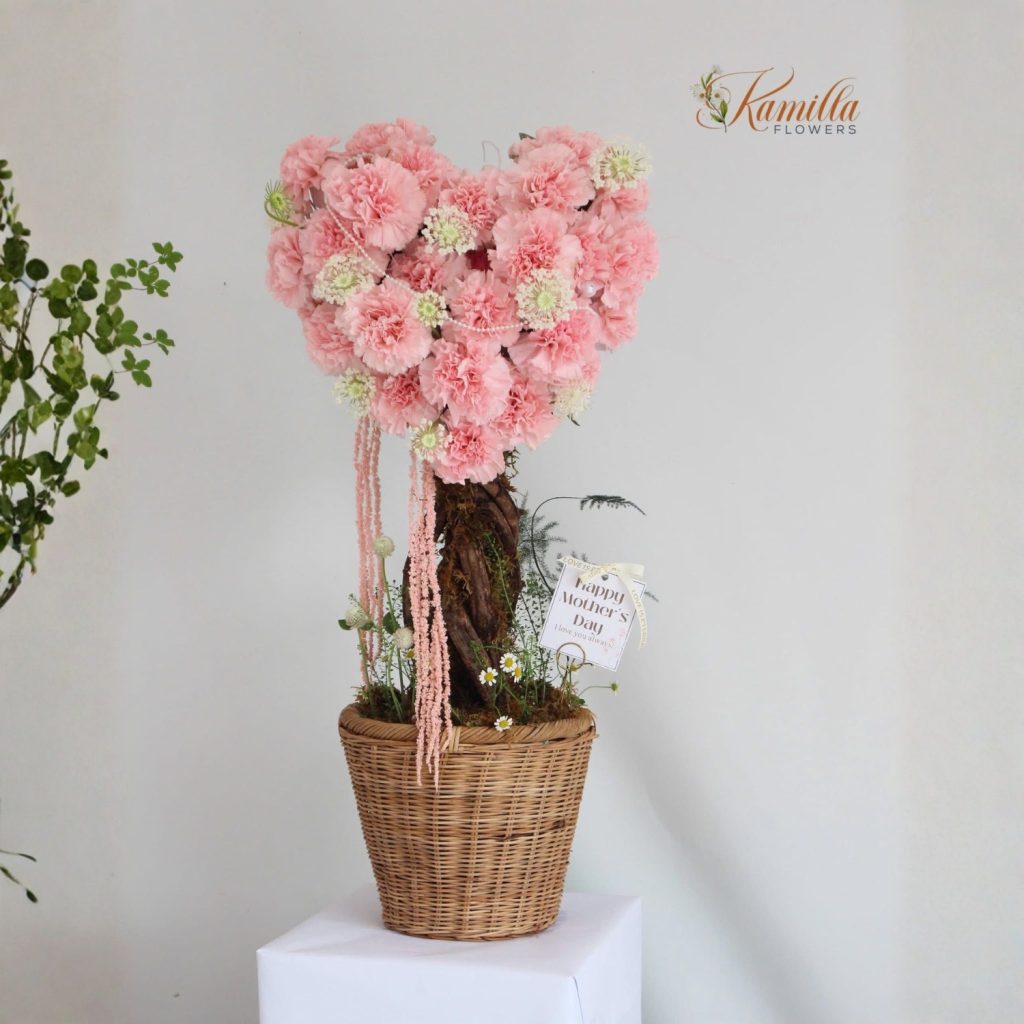 Thiết kế nổi bật với dáng trái tim mềm mại từ những bông cẩm chướng hồng phấn, tạo nên một tổng thể vừa lãng mạn vừa gần gũi. Không phải kiểu rực rỡ phô trương, giỏ hoa này chọn cách chạm đến người nhận bằng sự dịu dàng – giống như cách tình yêu lâu dài luôn hiện diện, không ồn ào nhưng bền bỉ.