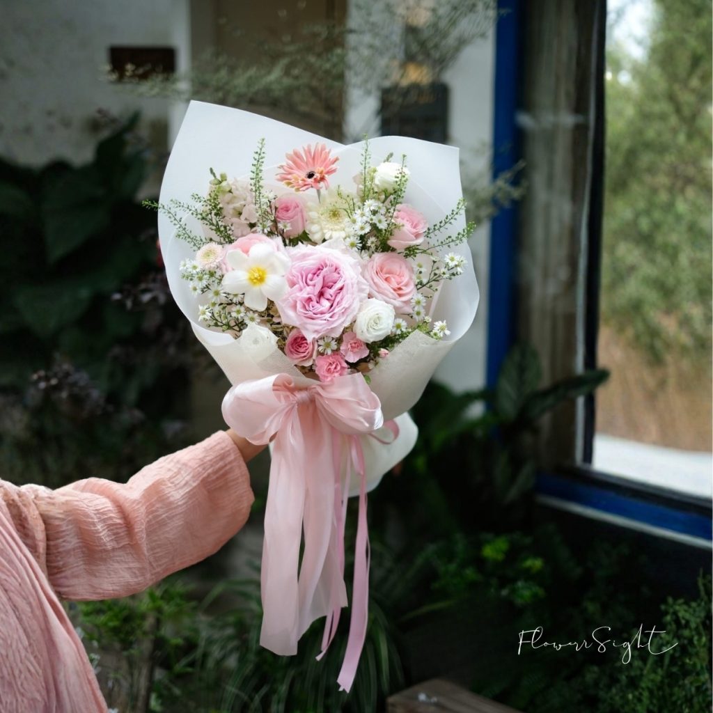 Gam màu hồng chủ đạo không quá rực, mà nghiêng về sắc pastel – vừa đủ ngọt, vừa đủ tinh tế. Những điểm trắng từ cúc tana và cát tường như làm dịu toàn bộ bố cục, khiến bó hoa trở nên hài hòa và dễ chạm đến cảm xúc người nhìn.