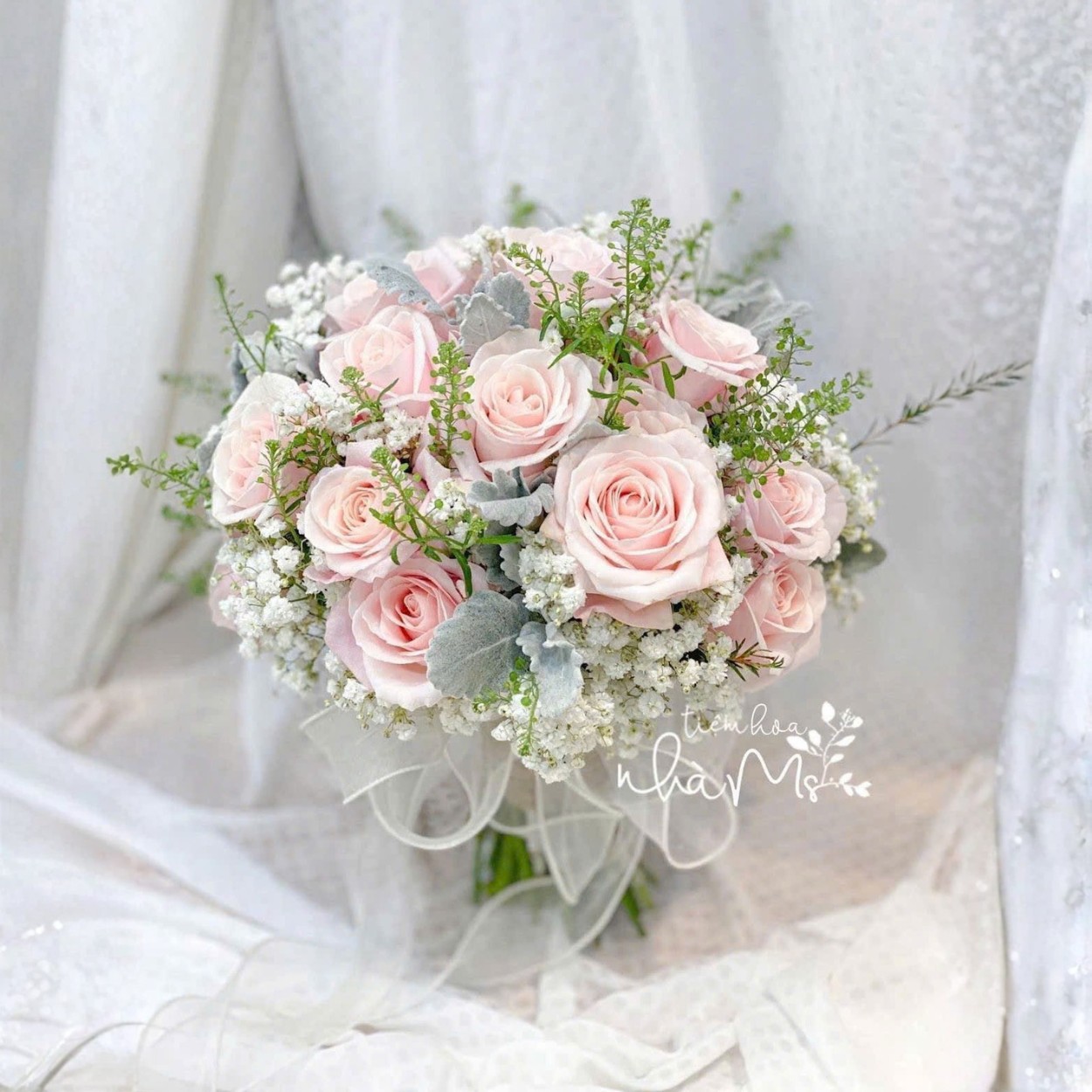 Điểm đặc biệt của Mystery of Love không nằm ở sự cầu kỳ mà ở cảm xúc nó mang lại. Sắc hoa nhẹ nhàng gợi nhớ đến sự e ấp của tình yêu ban đầu – trong trẻo, không ồn ào nhưng khiến mọi khoảnh khắc trở nên đẹp hơn.Lớp baby trắng bao quanh như những lời chúc phúc dịu dàng gửi đến cô dâu. Lá bạc tô điểm vẻ cổ điển, mang hơi hướng châu Âu, giúp tổng thể sang trọng theo cách rất tinh tế. Cả bó hoa giống như một hơi thở nhẹ, đủ để nâng bước cô dâu trong từng chuyển động.