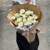 Hoa hồng trắng đóng vai trò trung tâm, mang đến cảm giác thuần khiết và trọn vẹn. Xen kẽ là cúc daisy nhỏ nhắn, như những điểm sáng li ti làm tổng thể trở nên sinh động hơn. Đồng tiền và cát tường giúp cân bằng bố cục, vừa đủ nổi bật nhưng không lấn át. Những nhánh cỏ đồng tiền mảnh mai tạo hiệu ứng bay nhẹ, khiến bó hoa không bị “nặng” mà luôn giữ được độ thoáng.