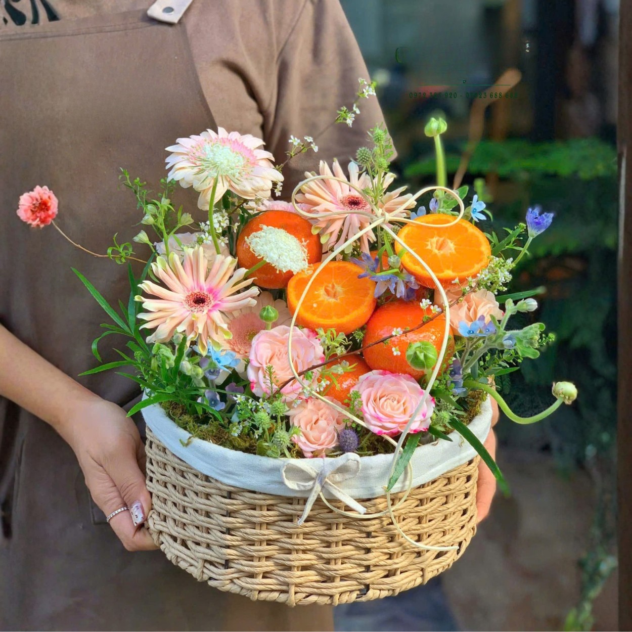 Giỏ hoa là sự phối hợp hài hòa giữa cam mọng nước, hoa hồng, hoa đồng tiền, sao xanh và lá phụ, được sắp đặt trong giỏ mây đan tay. Màu cam của trái cây làm nền cho những cánh hoa hồng phớt nhẹ và đồng tiền rực rỡ nổi bật – vừa ngọt ngào vừa tràn đầy năng lượng.