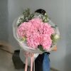 Nhìn tổng thể, bó hoa gây ấn tượng bởi cụm cẩm tú cầu hồng nở đầy, tròn chắc, tạo thành “đám mây” phấn nhẹ ở trung tâm. Màu hồng không gắt, thiên về tông pastel nên lên ảnh rất trong, nhìn ngoài đời lại càng mịn mắt—kiểu đẹp khiến người ta muốn ngắm lâu hơn một chút.