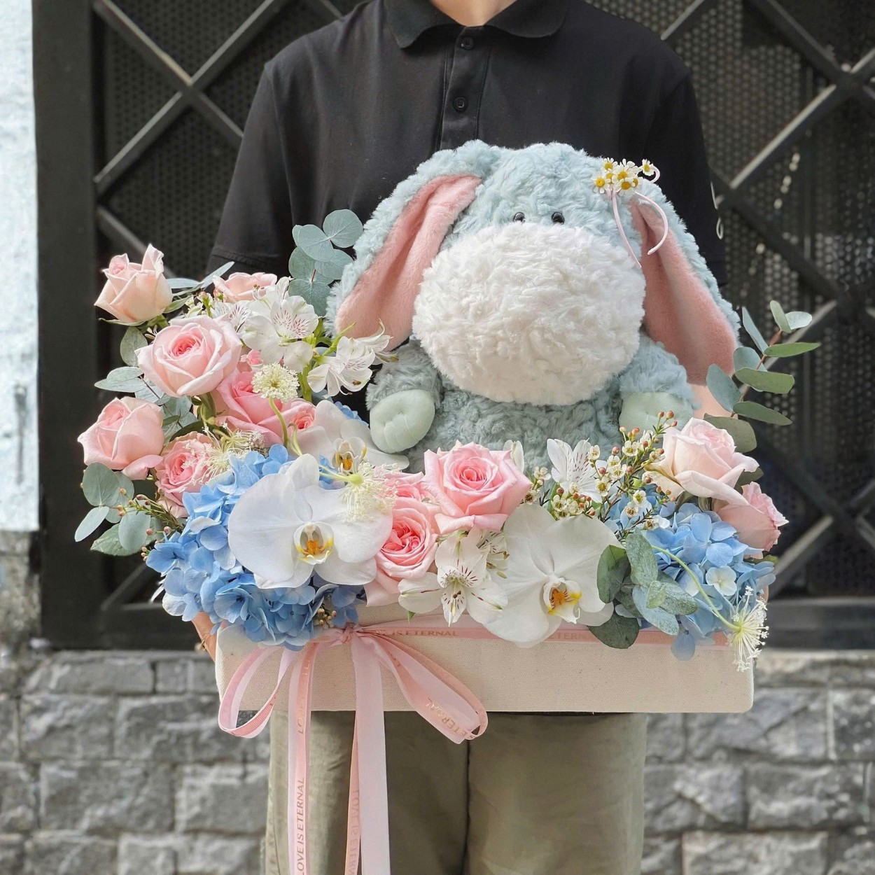 “Ngát Hương Hạ” là kiểu bó hoa gấu dành cho người yêu sự thanh khiết. Tông hồng phấn của hồng O’Hara kết hợp sắc xanh biển của tú cầu tạo lớp nền mềm mại, lan hồ điệp trắng buốt vươn nhịp duyên dáng ở vị trí cao nhất để dẫn mắt. Xen giữa là những bông tana li ti như hạt nắng rải nhẹ, khiến tổng thể trở nên trong trẻo và có chiều sâu. Gấu bông được đặt ở điểm trung tâm gần mặt trước, không che hoa mà như một lời thủ thỉ ấm áp, giúp bó hoa có linh hồn riêng.