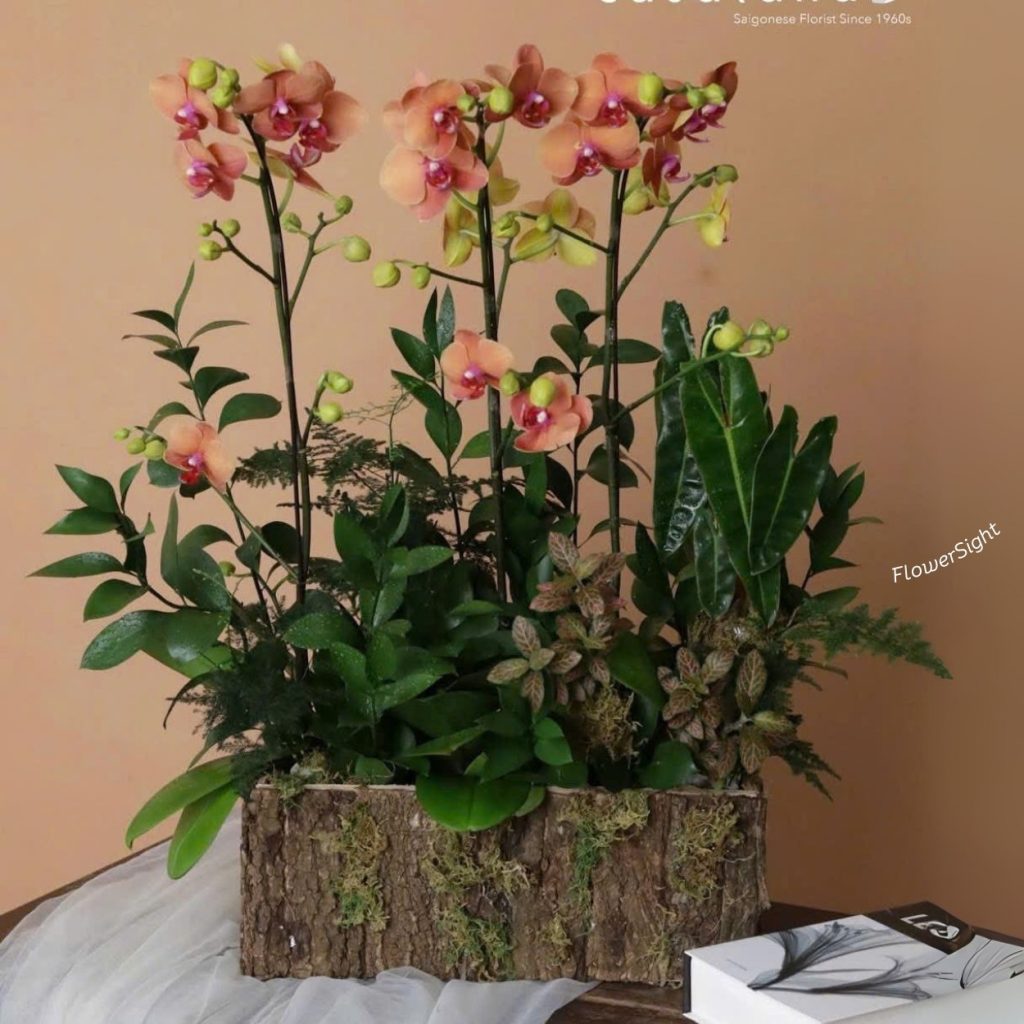Trong những dịp đặc biệt như sinh nhật sếp hay kỷ niệm công ty, chậu hoa là lựa chọn hoàn hảo. Sự kết hợp giữa lan, lá chanh và dương xỉ trong hộp gỗ tạo nên vẻ đẹp sang trọng, trang nhã.