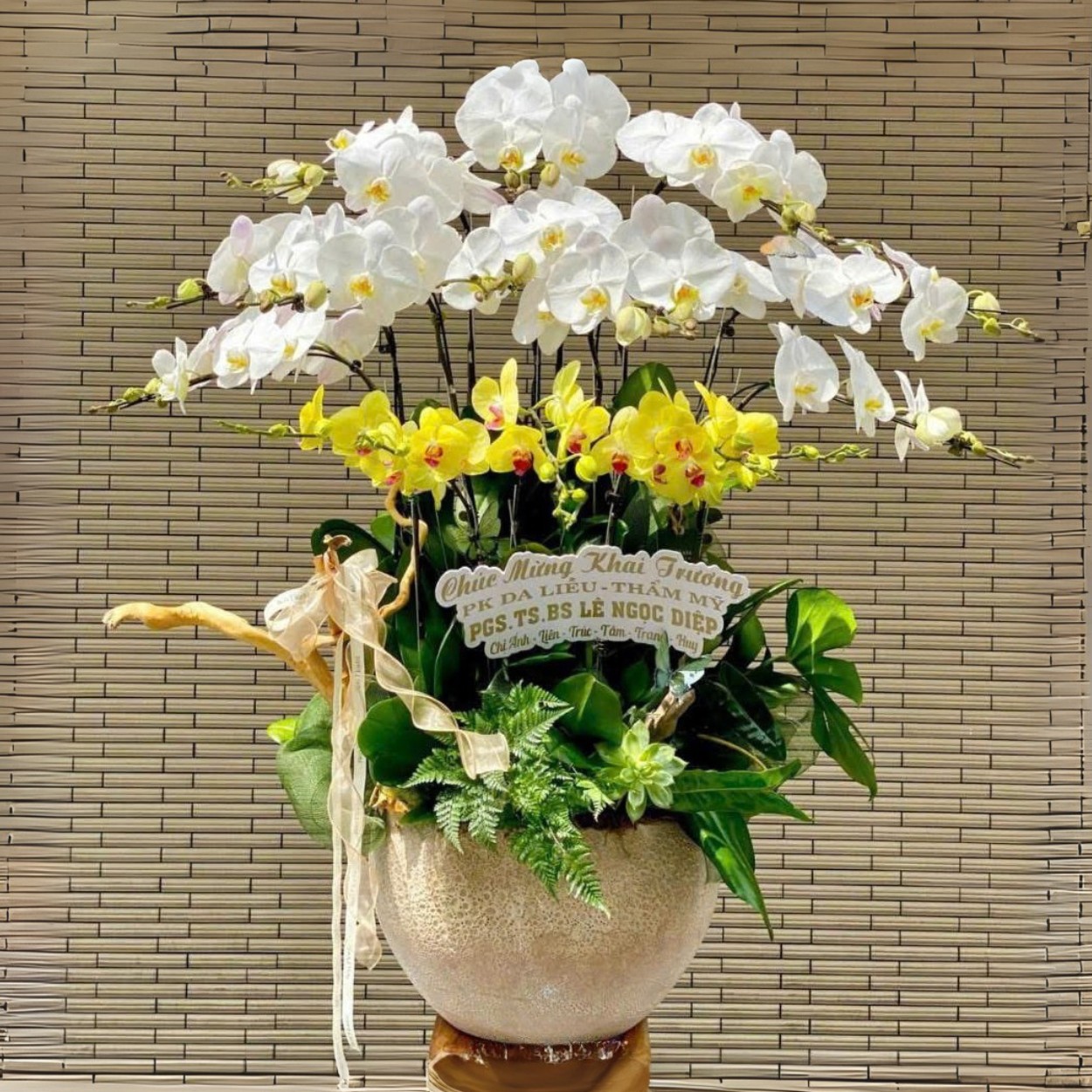 Để gửi lời chúc thịnh vượng và đoàn kết, bó hoa rất phù hợp trong dịp công ty tròn năm thành lập hoặc kỷ niệm cột mốc quan trọng. Vẻ đẹp sang trọng của chậu lan tượng trưng cho sự phát triển bền vững và gắn kết đồng nghiệp, đối tác.