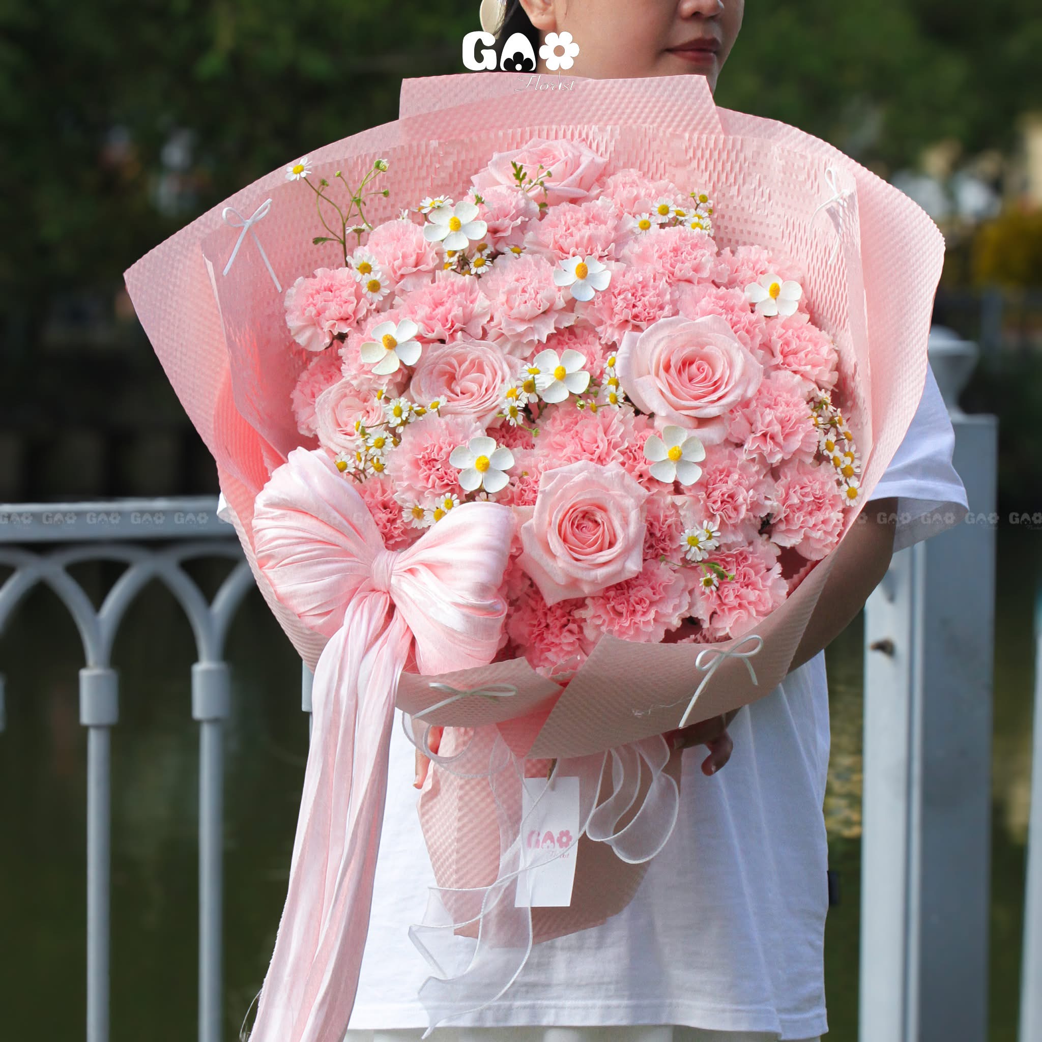 Bó hoa được kết hợp với giấy gói và nơ đẹp mắt, tạo nên một món quà hoàn hảo để tặng người thân yêu, bạn bè hay đối tác trong dịp sinh nhật.
