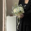 Không đi theo phong cách bó tròn truyền thống, “Người đầu tiên” được thiết kế theo lối tự nhiên có chủ ý: hoa cao – thấp xen kẽ tạo độ chuyển lớp mềm, giúp bó hoa nhìn từ mọi góc đều có độ sâu và độ thoáng.Cách xử lý sắc độ trắng – xanh được cân bằng cẩn thận: trắng làm nền tinh khiết, xanh tạo độ mát mắt, cỏ suối tạo độ mềm – tất cả để bó hoa vừa sang trọng vừa mang chút thơ, phù hợp với những cô dâu yêu sự tối giản nhưng vẫn muốn có điểm chạm cảm xúc riêng.