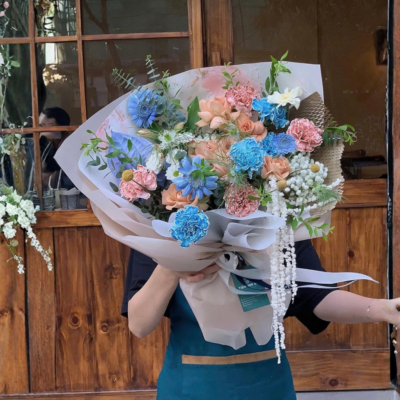 Bó hoa đi theo tinh thần “jazz” đúng nghĩa: không rập khuôn, có nhịp điệu và chuyển sắc tinh tế. Hoa đồng tiền xanh và những cụm cẩm chướng xanh tạo điểm rơi thị giác, giống như vài nốt nhạc sáng bừng trên nền đêm. Xen giữa là hoa hồng tone đào – kem cho cảm giác ấm, dịu và rất “mẹ”. Những bông cẩm chướng hồng được đặt rải rác để bó hoa có độ bồng, mềm, nhìn gần càng thấy sang.Phần hoa phụ được chọn khéo để bó hoa không bị “nặng”: cúc nút và baby trắng tạo độ thoáng, giúp tổng thể sáng và sạch. Xen kẽ là lá bạc (tạo hiệu ứng mát mắt, hiện đại) và lá kiếm (kéo dáng, giúp bó hoa trông cao, thanh). Nếu bạn để ý, bố cục bó hoa có chủ ý “mở”: hoa hướng ra ngoài theo nhiều hướng nhỏ, tạo cảm giác tự nhiên như một khu vườn mini đang nở.